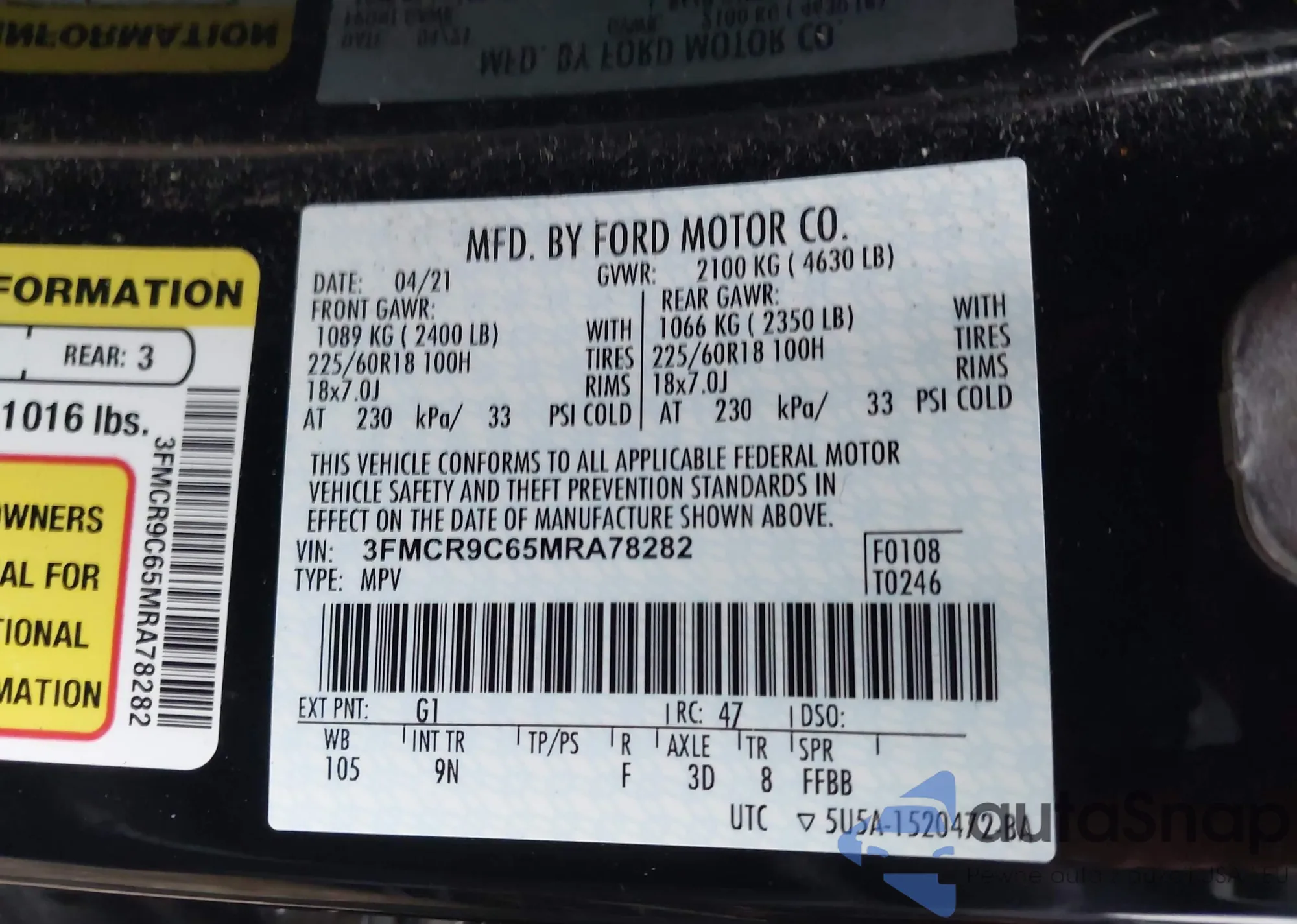 LOT: 43747057 VIN: 3FMCR9C65MRA78282