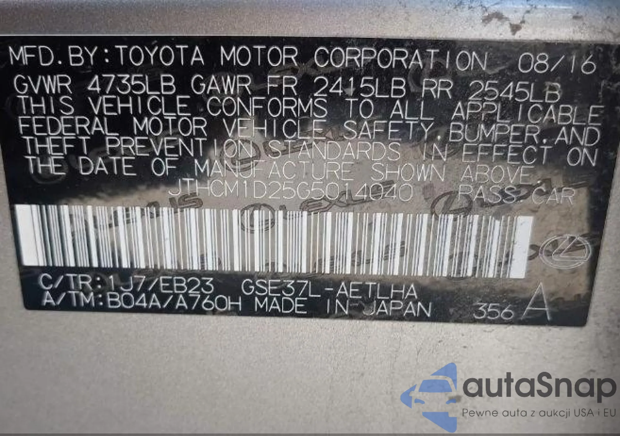 • VIN 5J6RM3H73EL031760