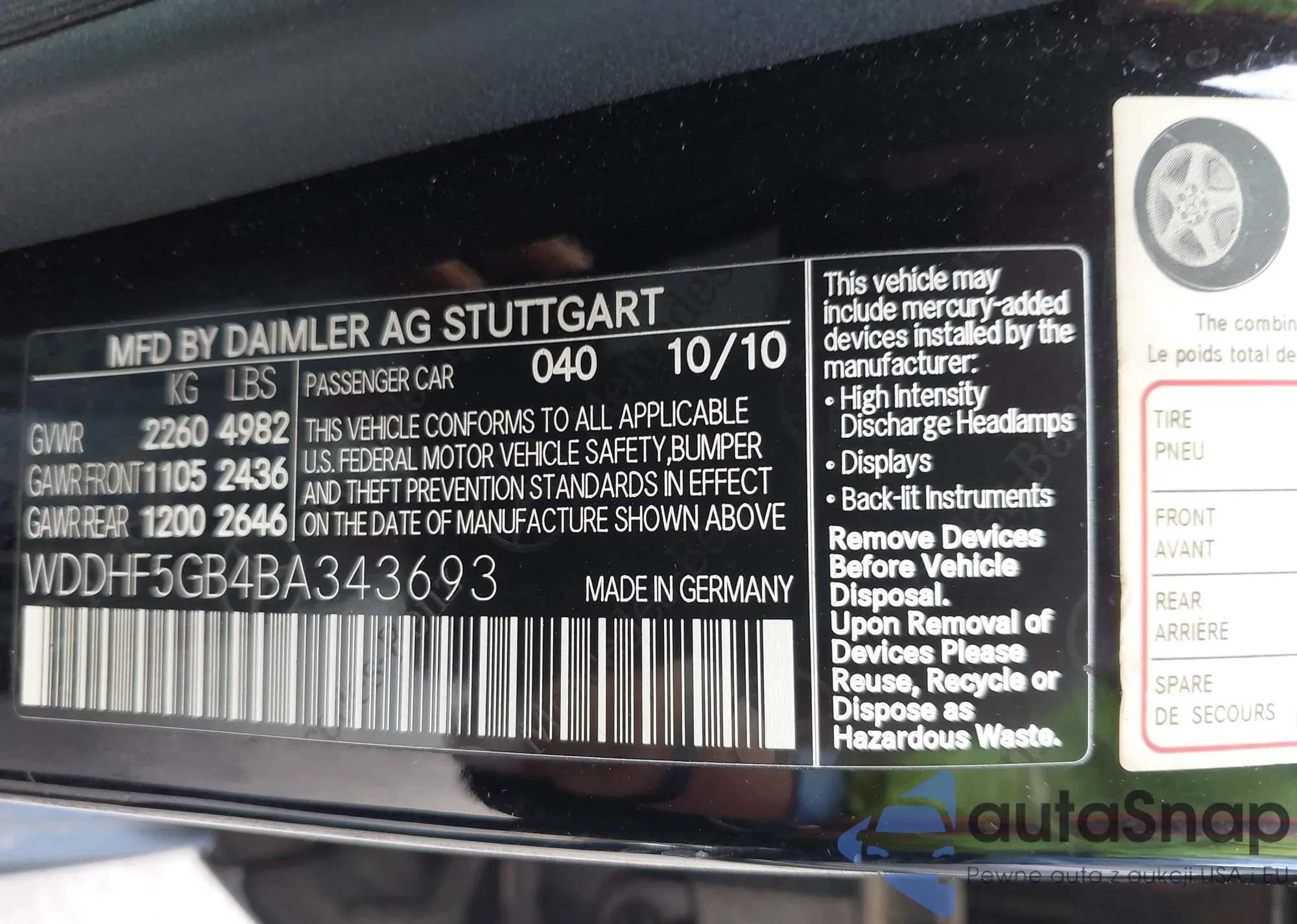 LOT: 43471269 VIN: WDDHF5GB4BA343693