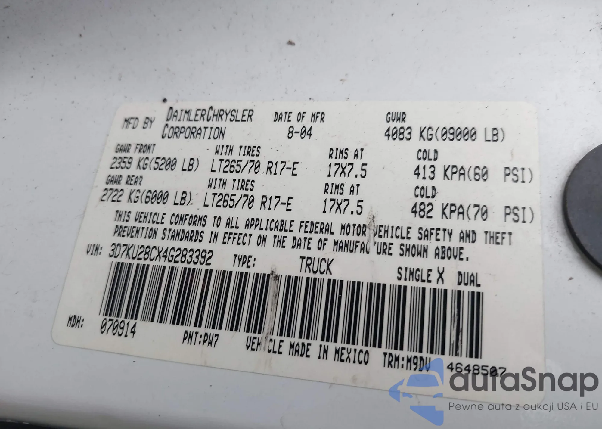 LOT: 43317255 VIN: 3D7KU28CX4G283392