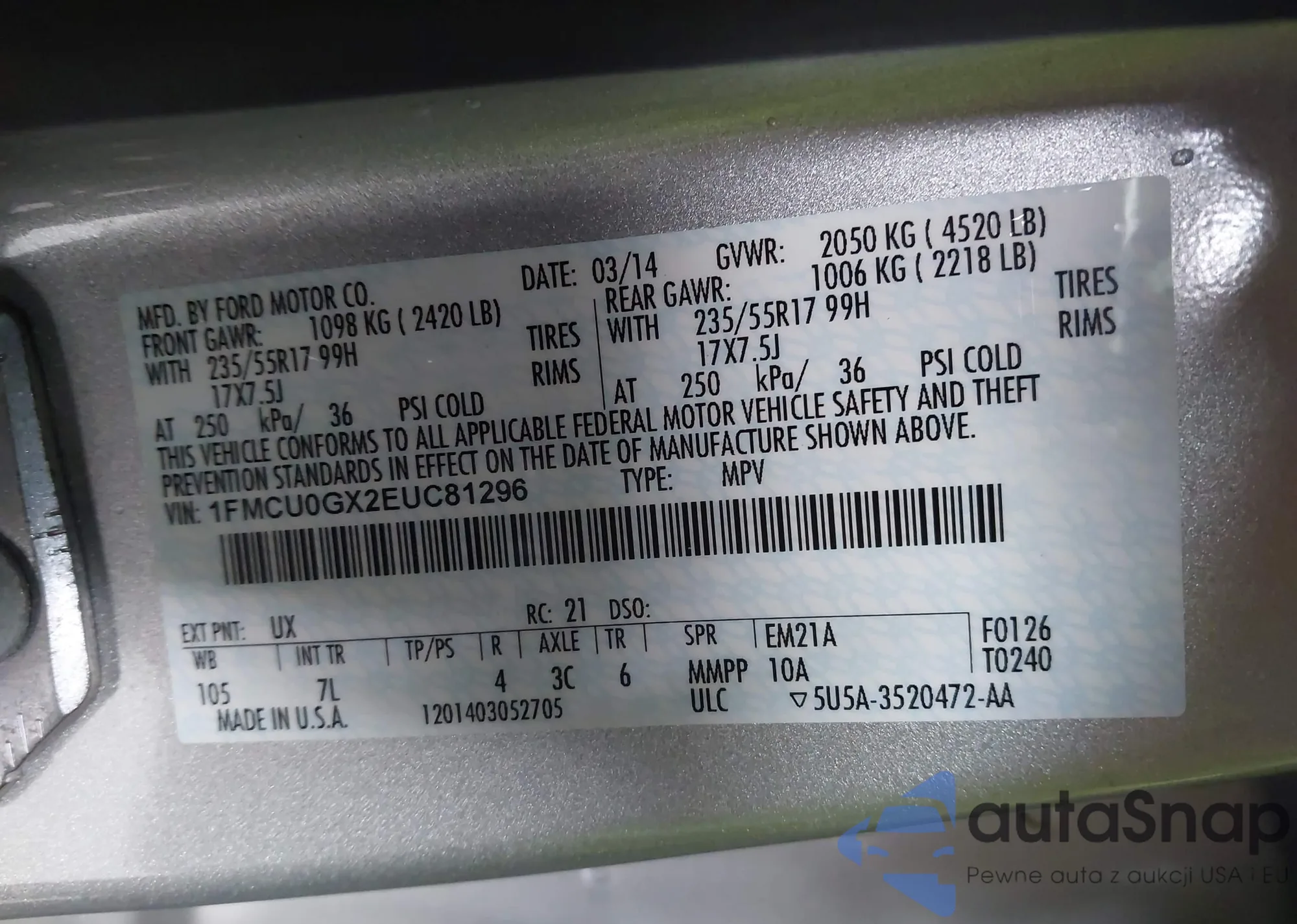 LOT: 43451325 VIN: 1FMCU0GX2EUC81296