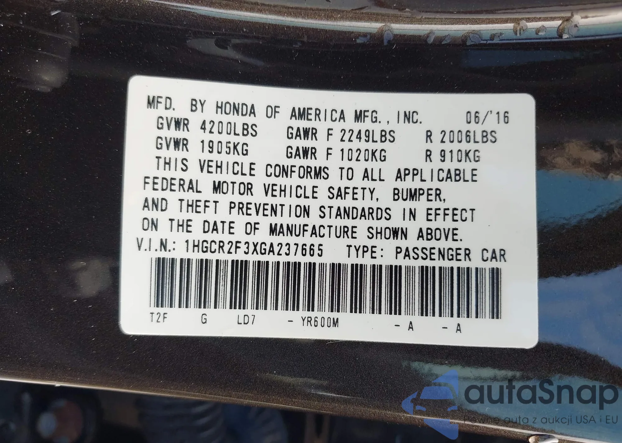 • VIN 1HGCR2F3XGA237665