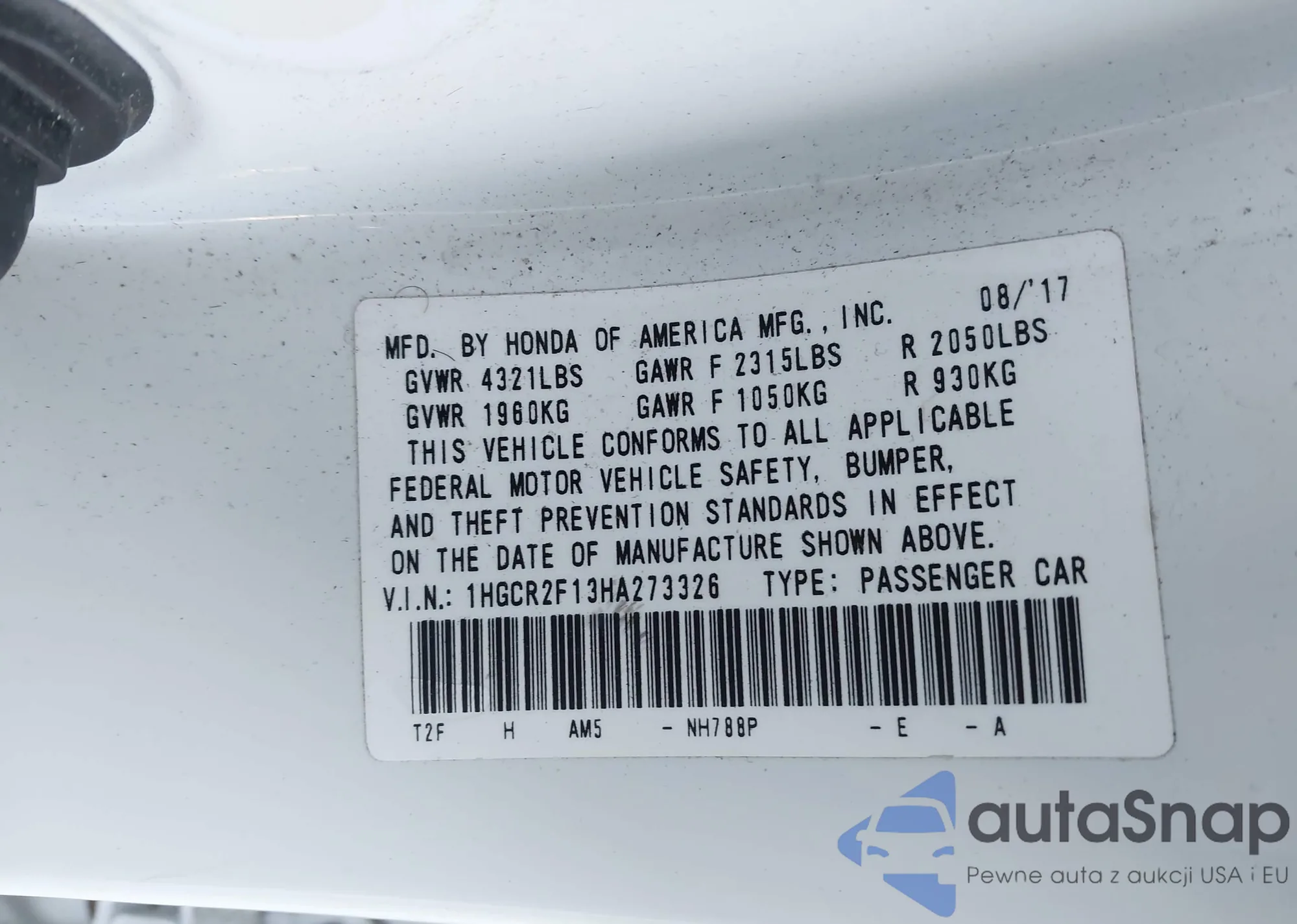 • VIN 1HGCR2F13HA273326
