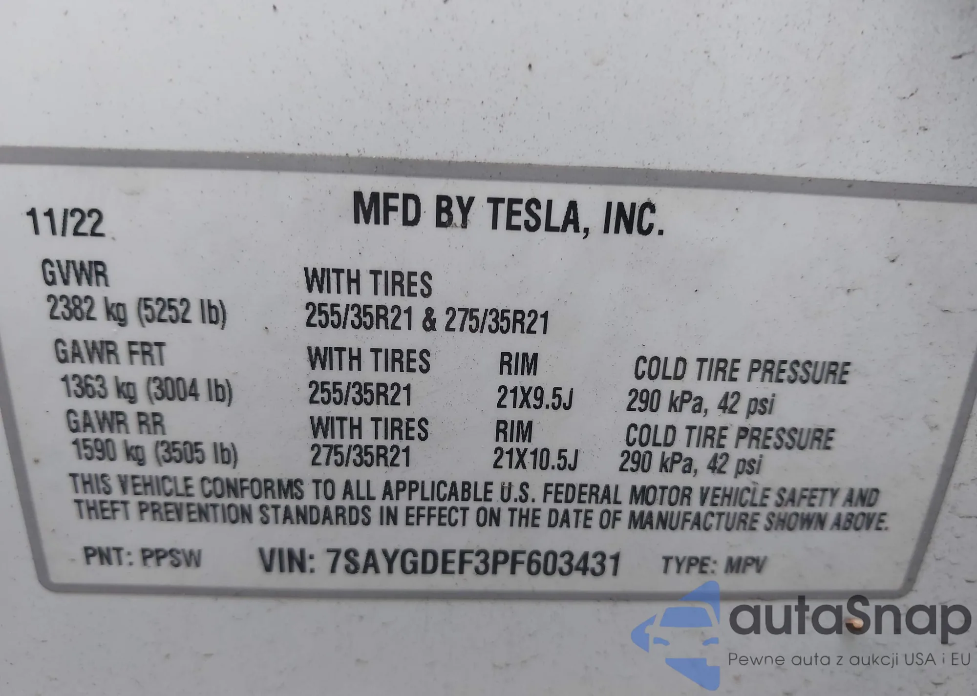 • VIN 7SAYGDEF3PF603431