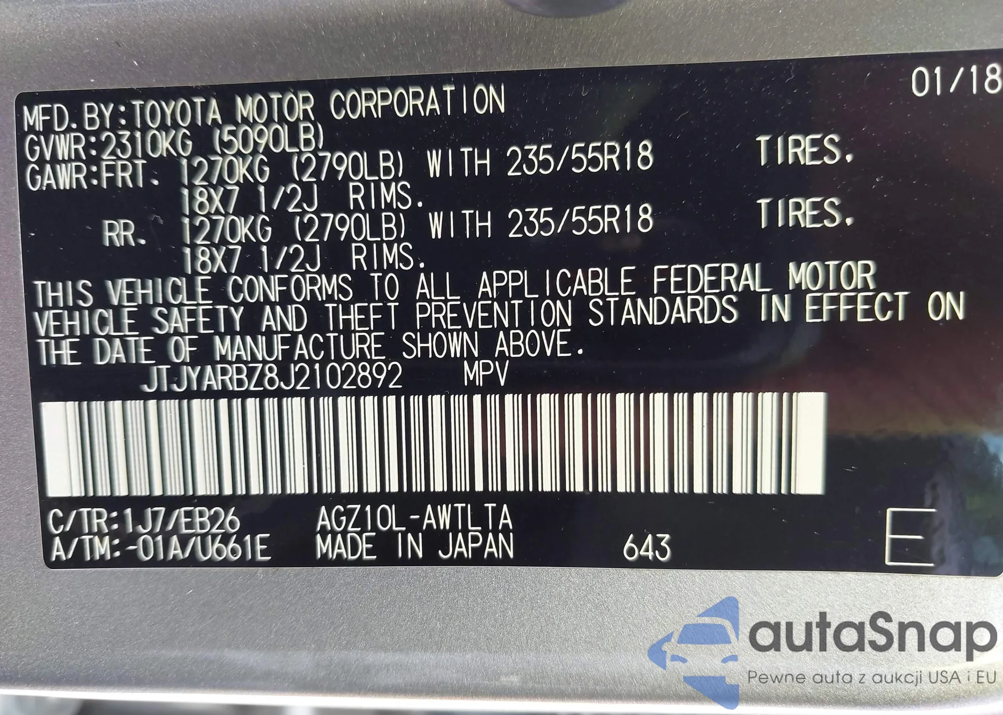 LOT: 43266616 VIN: JTJYARBZ8J2102892