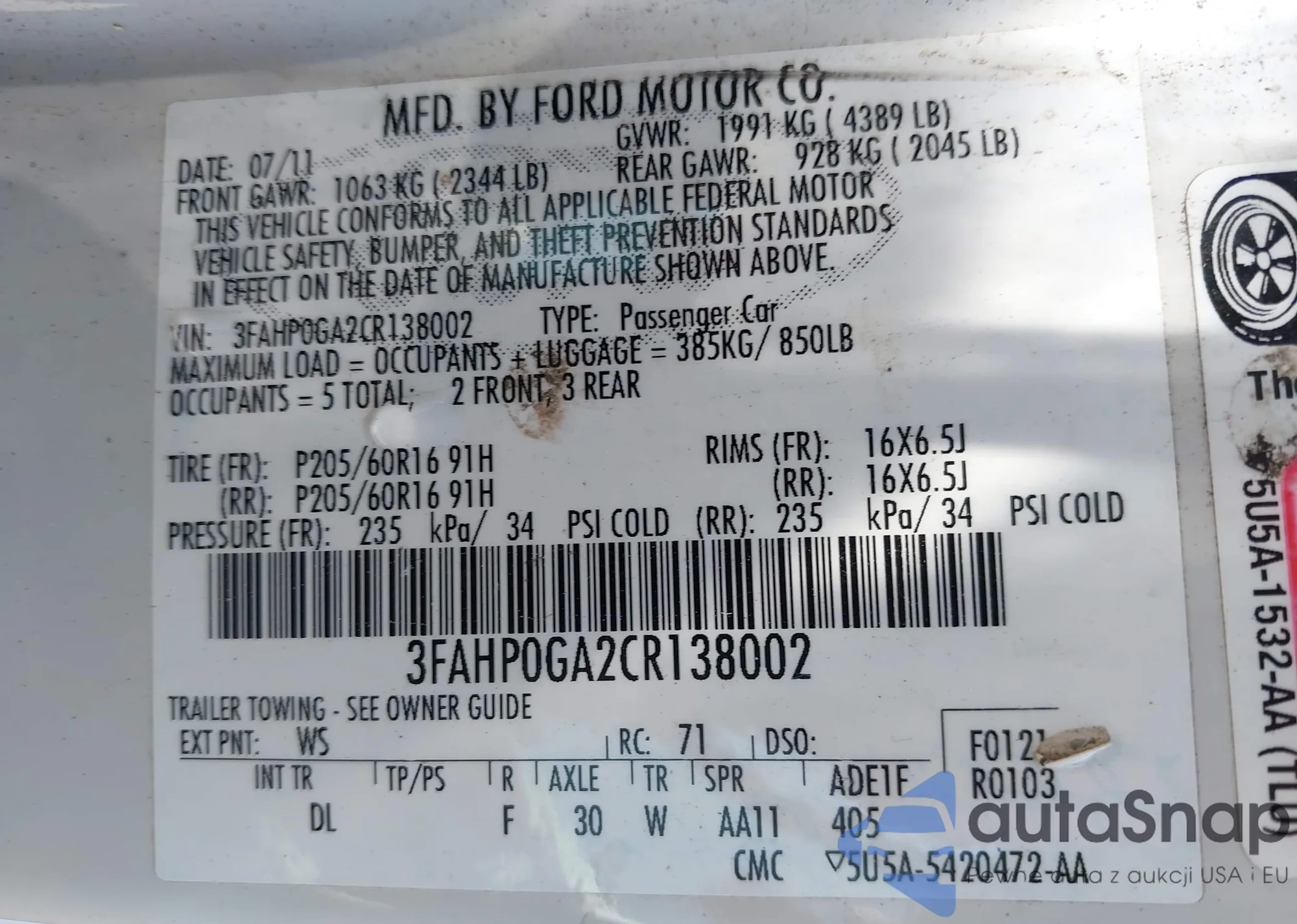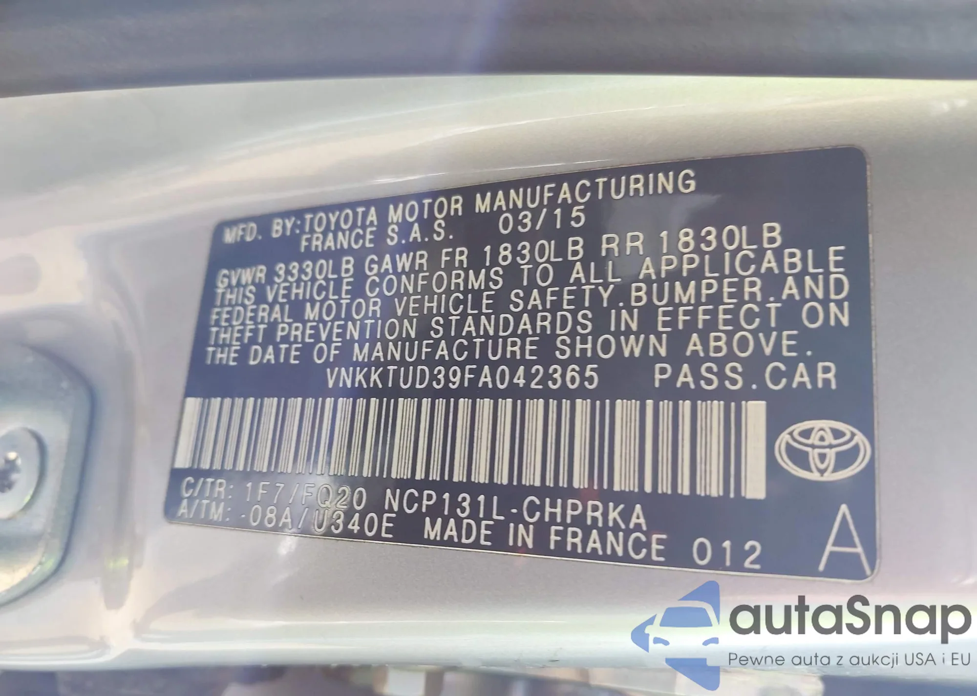 • VIN VNKKTUD39FA042365