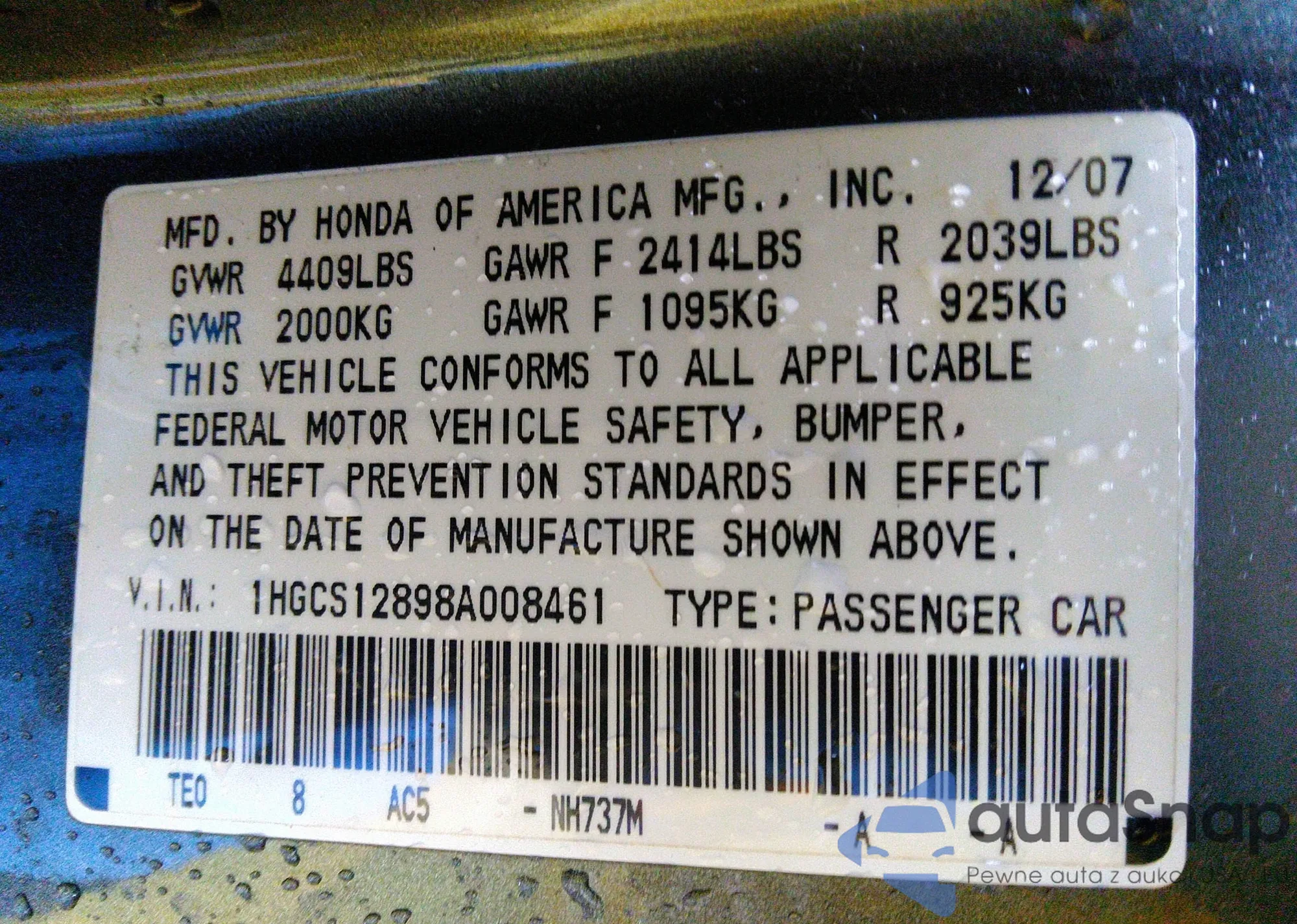 LOT: 40953413 VIN: 1HGCS12898A008461