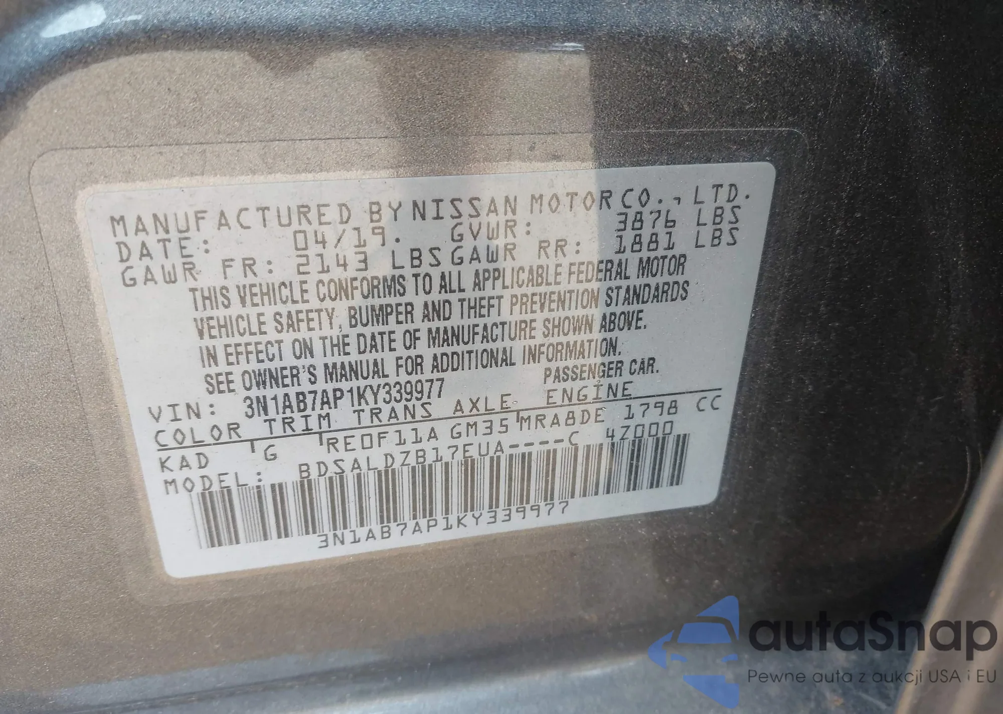 LOT: 43315698 VIN: 3N1AB7AP1KY339977