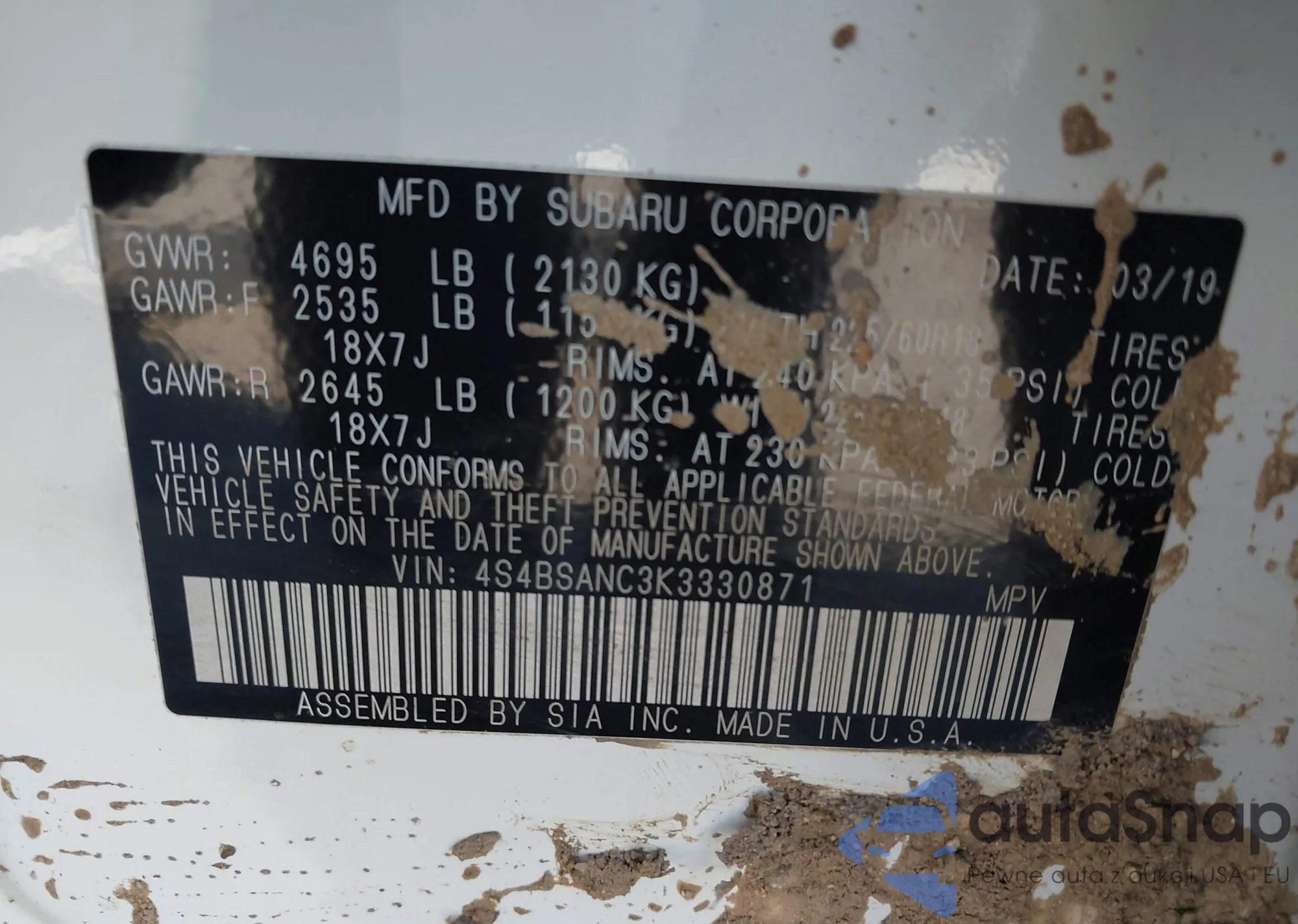 LOT: 43432389 VIN: 4S4BSANC3K3330871