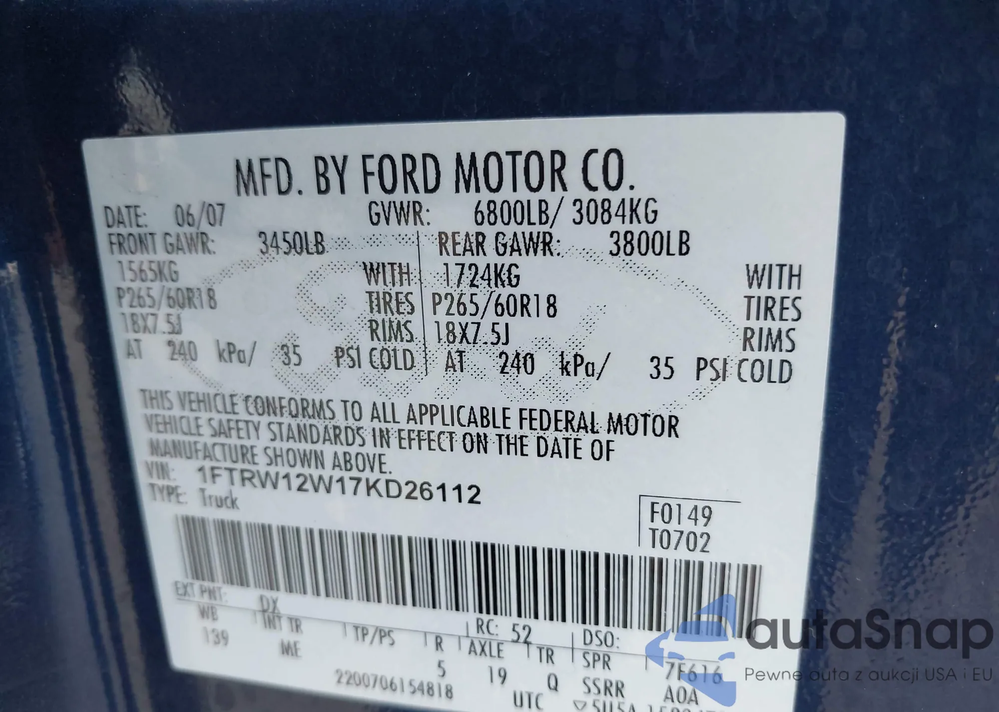 LOT: 43458038 VIN: 1FTRW12W17KD26112