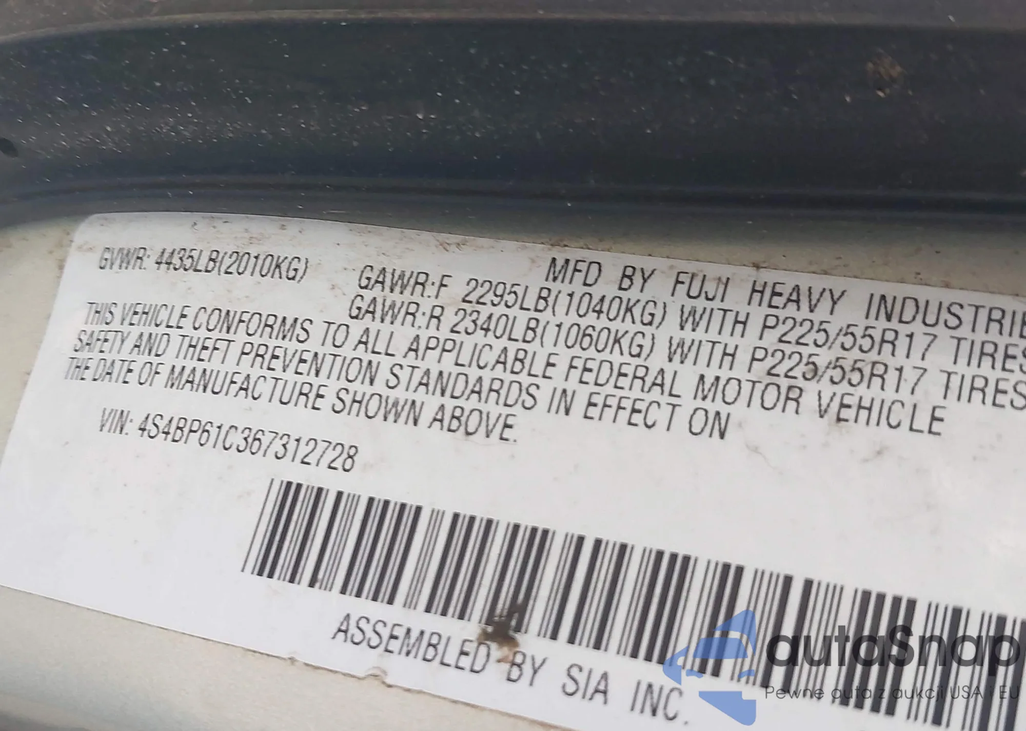 • VIN 4S4BP61C367312728