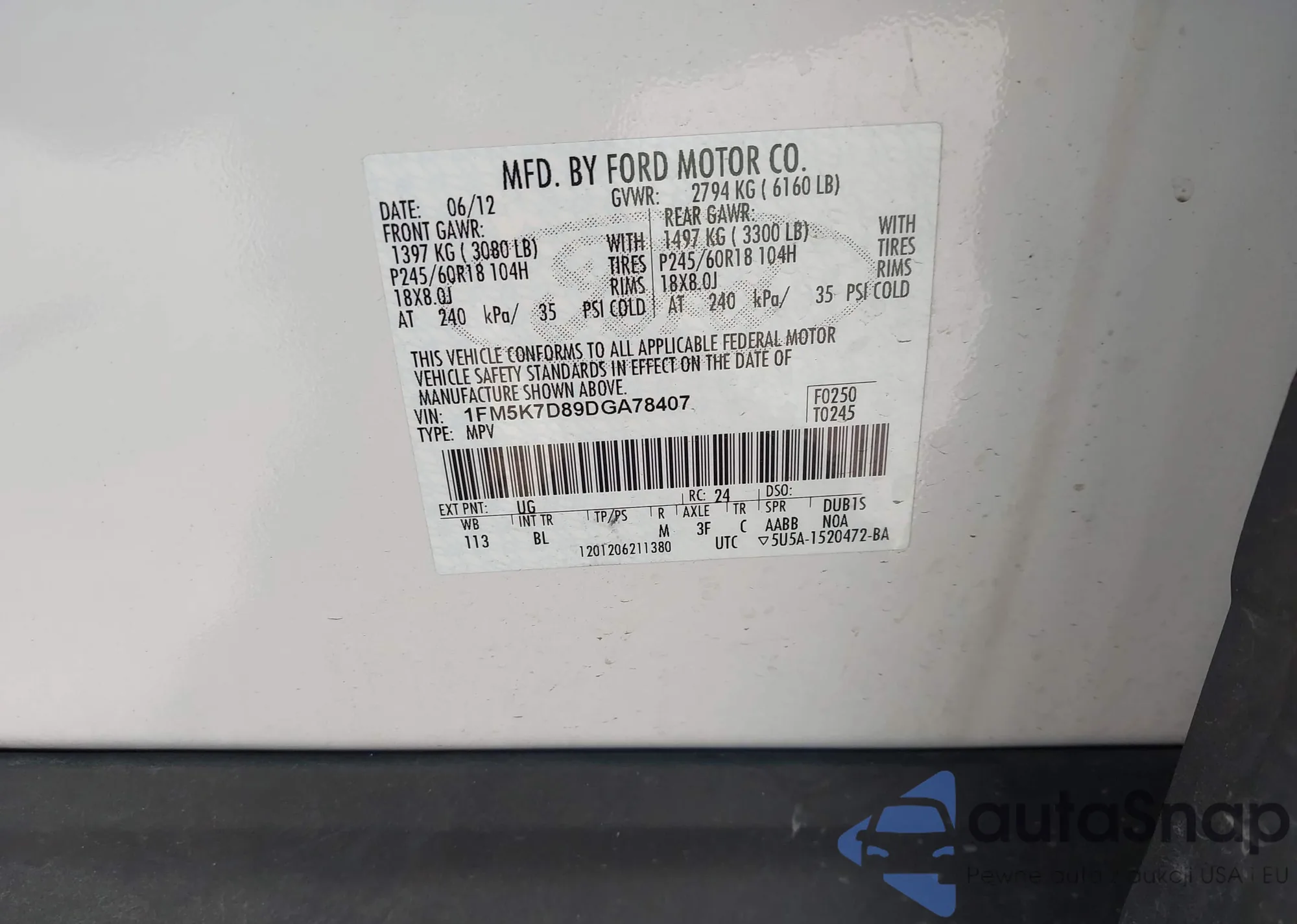 LOT: 43190332 VIN: 1FM5K7D89DGA78407