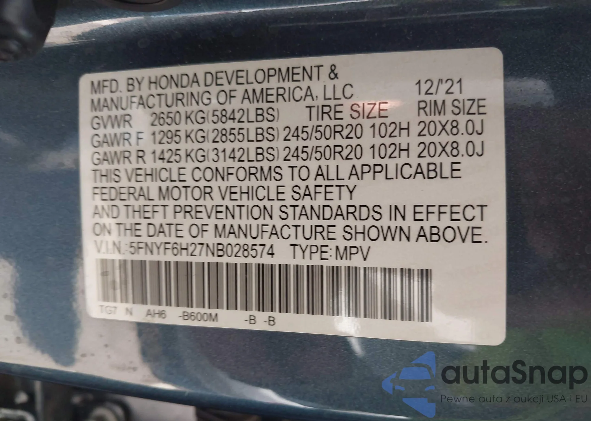 LOT: 43267756 VIN: 5YFDPMAE7NP376416