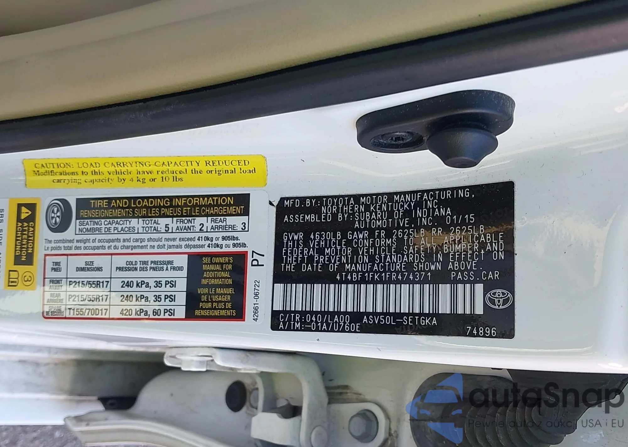 • VIN 4T4BF1FK1FR474371