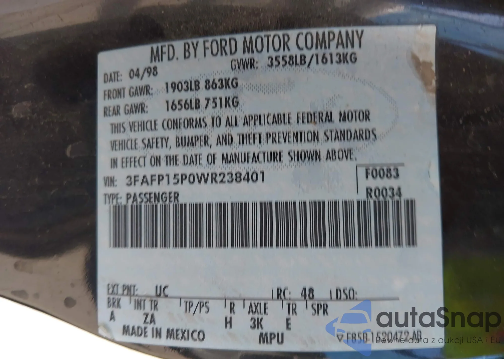 • VIN 4S3BNBC64F3071487