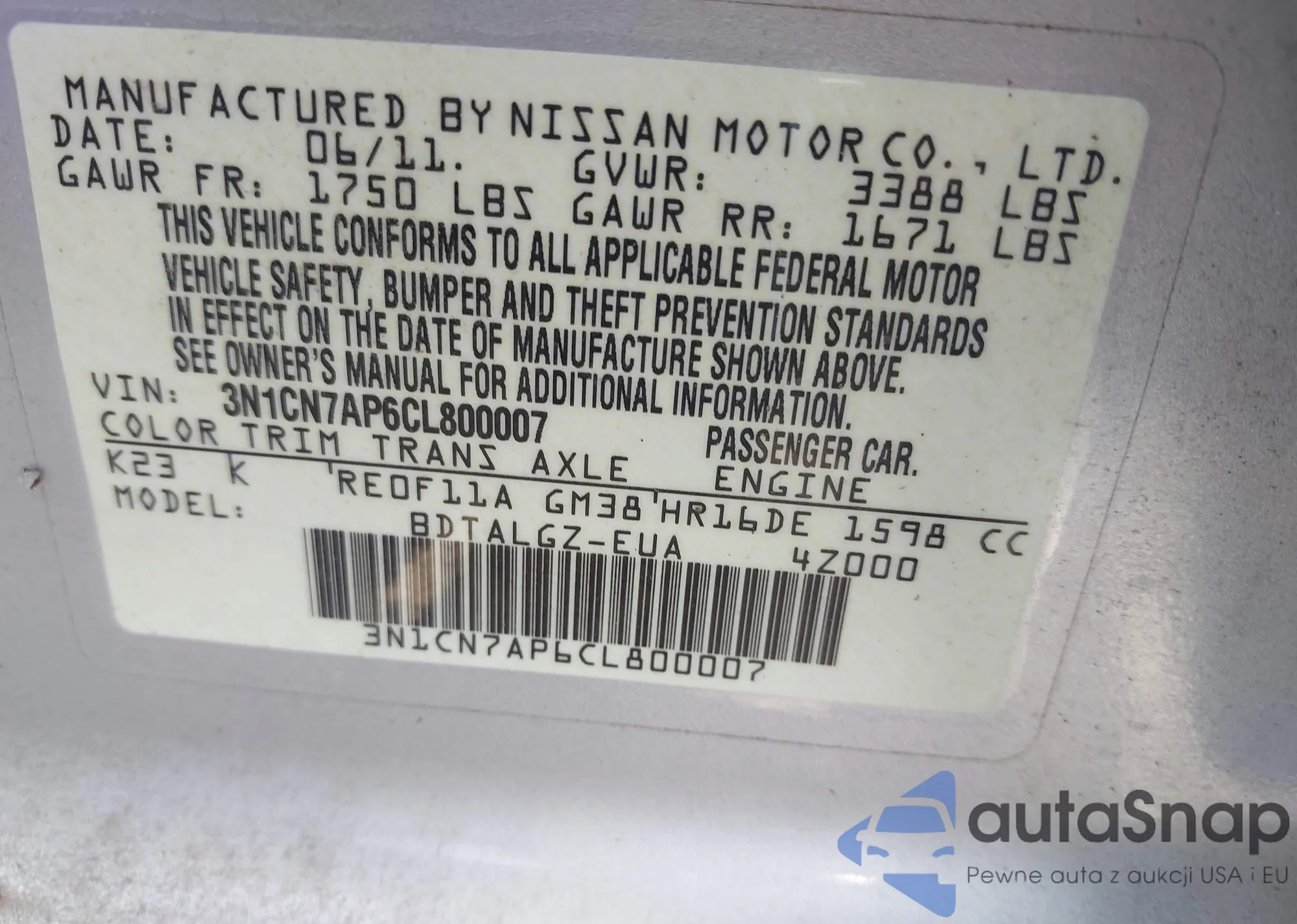 • VIN 3N1CN7AP6CL800007