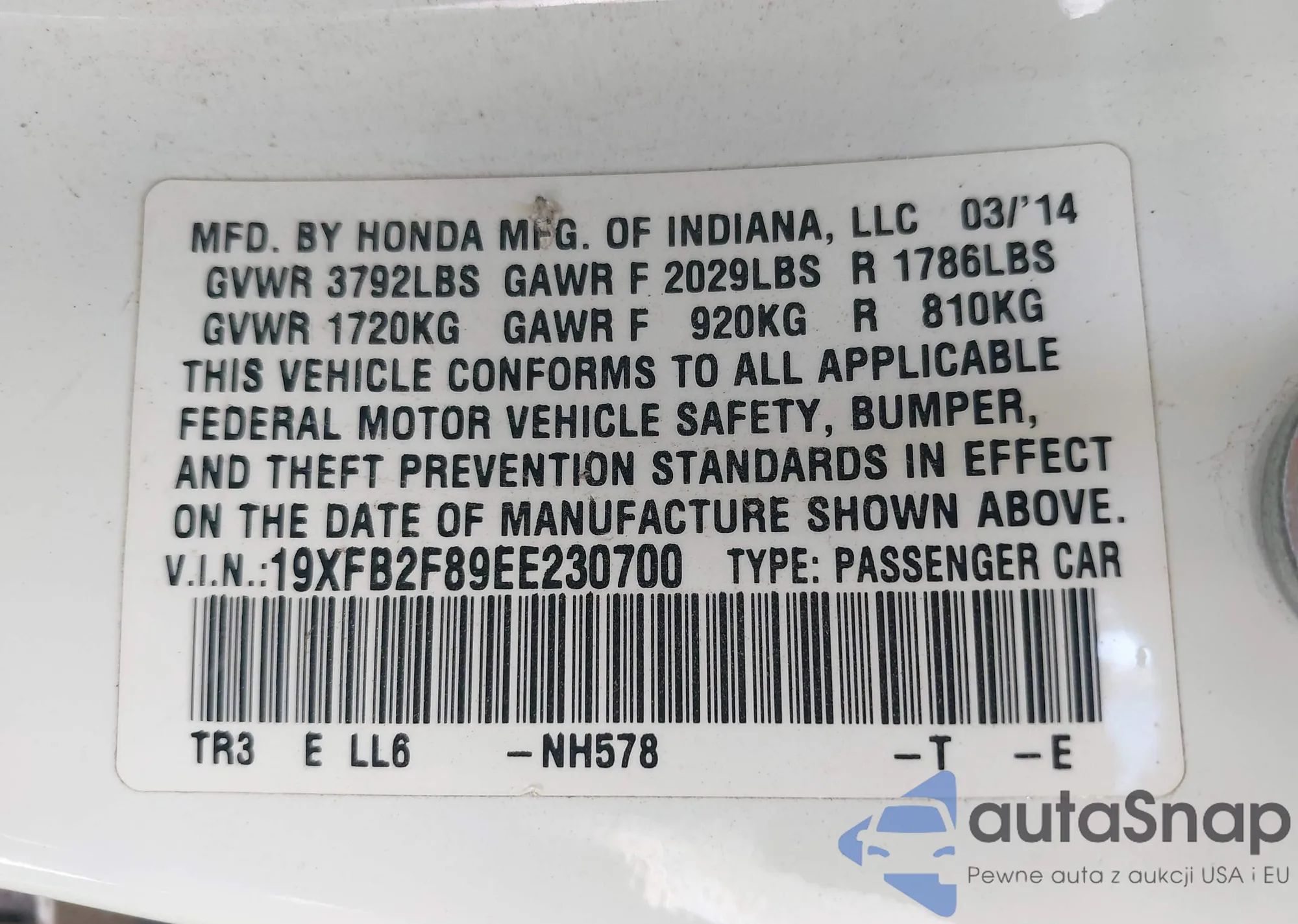 • VIN 19XFB2F89EE230700