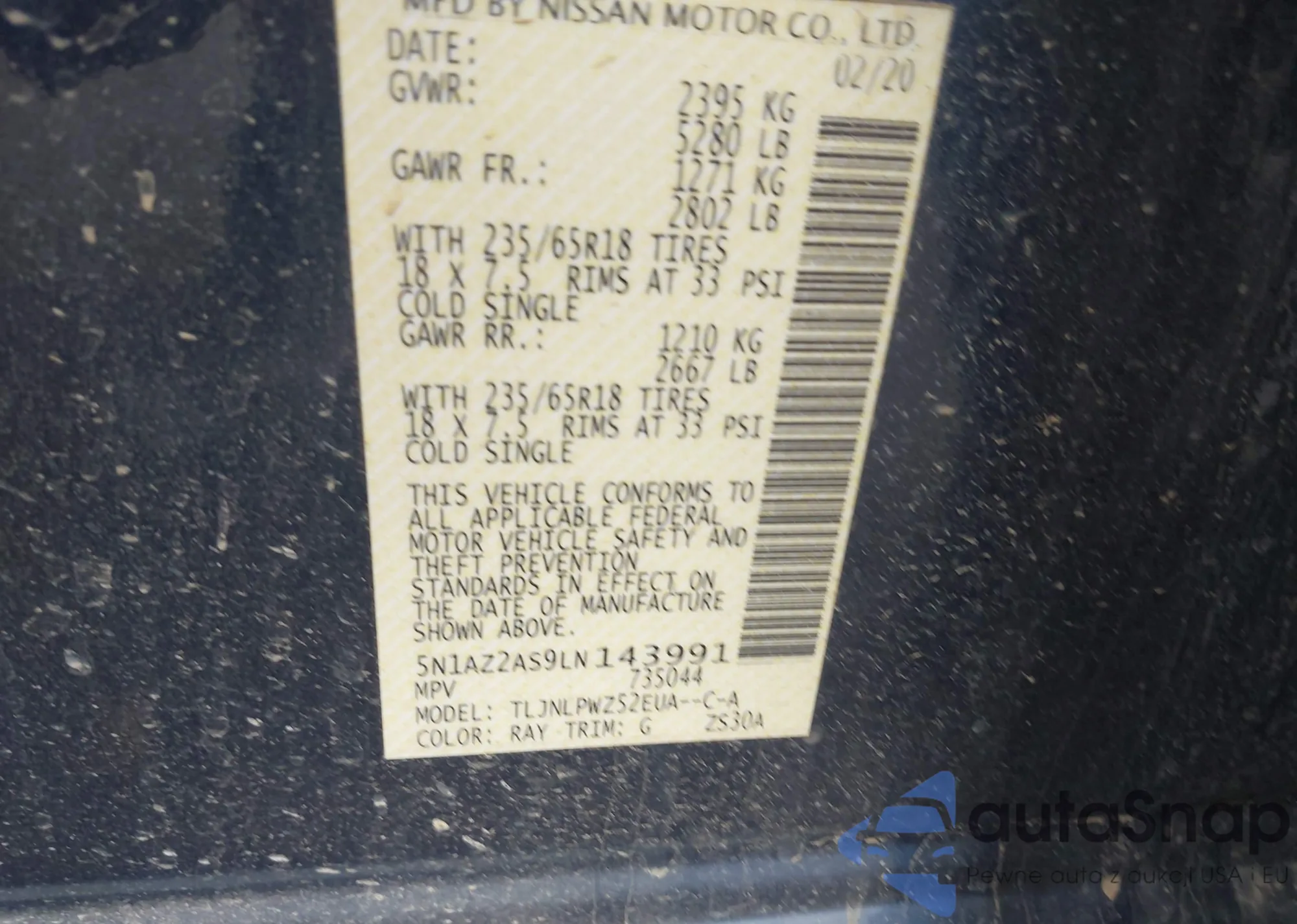 LOT: 43302919 VIN: 5N1AZ2AS9LN143991