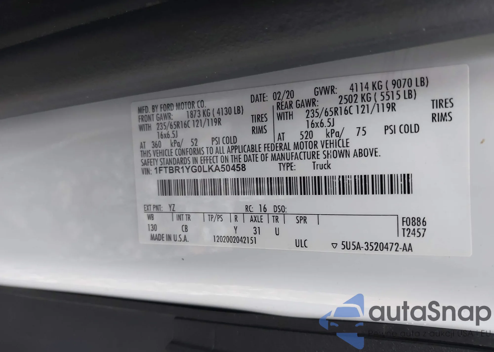 LOT: 43396195 VIN: 1FBAX2CG0LKA66503
