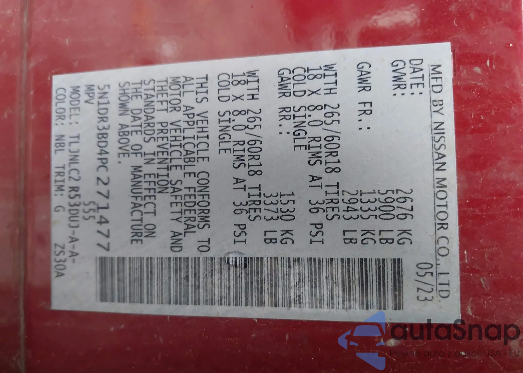 • VIN 5N1DR3BD4PC271477