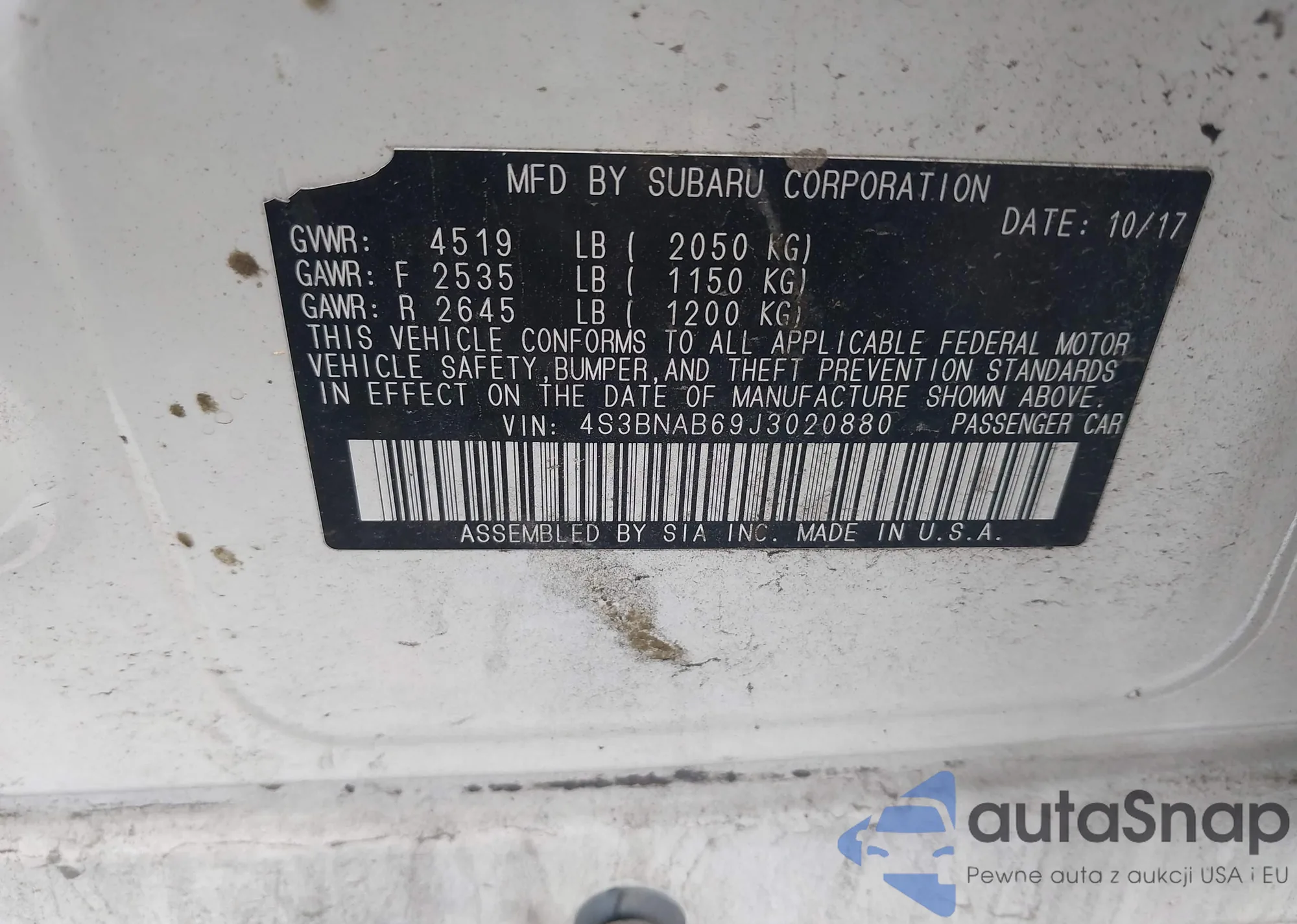 • VIN 4S3BNAB69J3020880