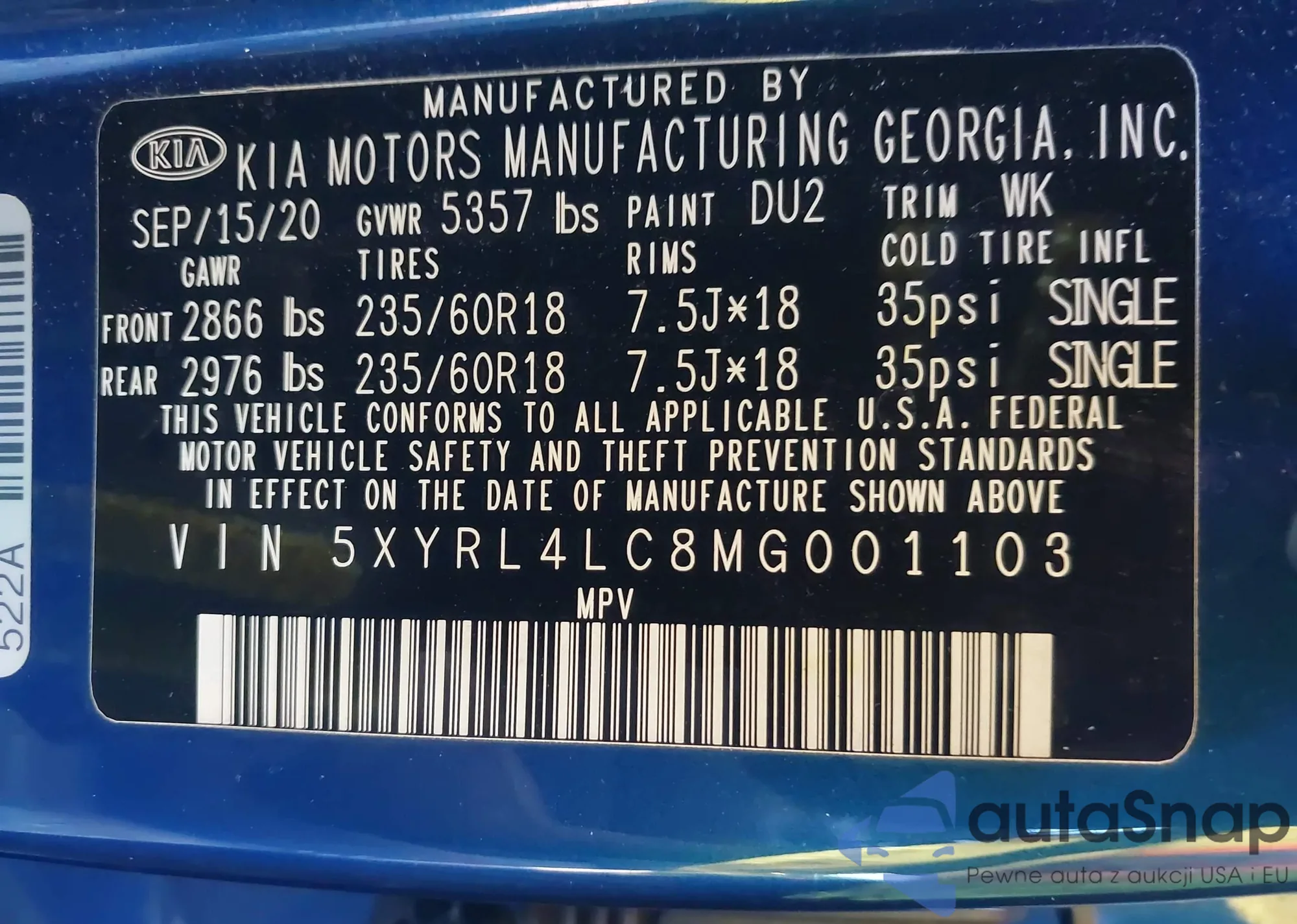 • VIN 5XYRL4LC8MG001103