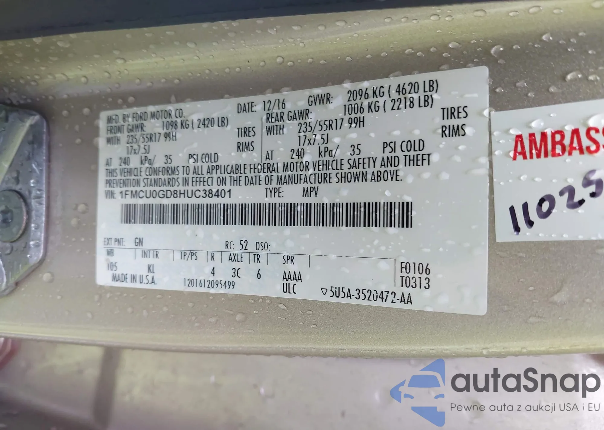 LOT: 43044418 VIN: 1FMCU0GD8HUC38401