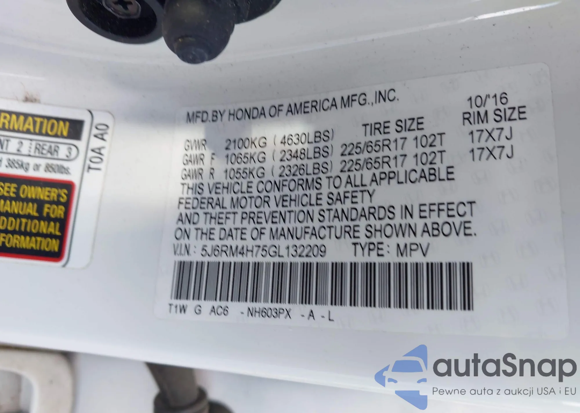 • VIN 5J6RM4H75GL132209
