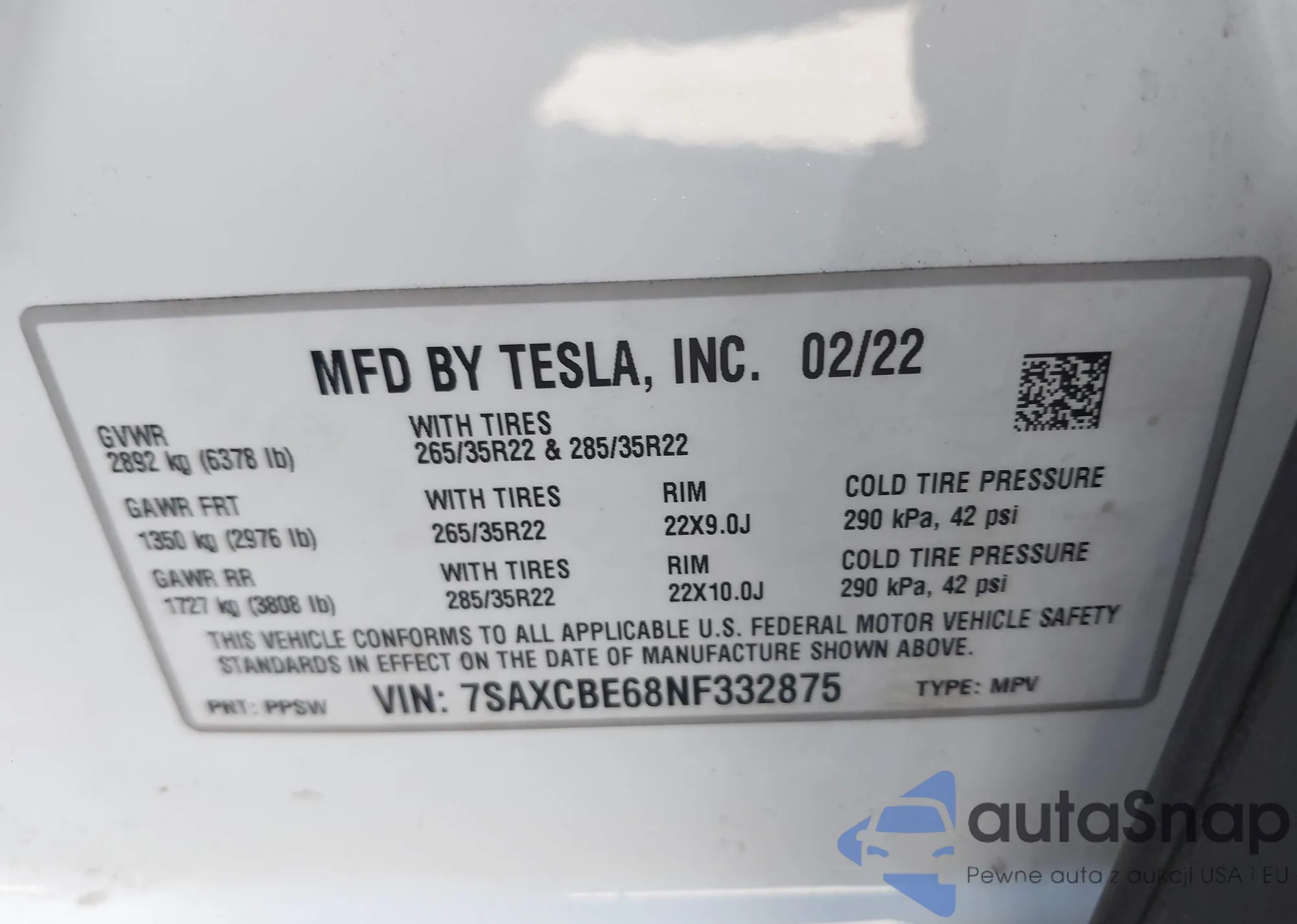 2022 Tesla Model X Plaid Tri Motor All-Wheel Drive z USA, uszkodzony, nr VIN 7SAXCBE68NF332875