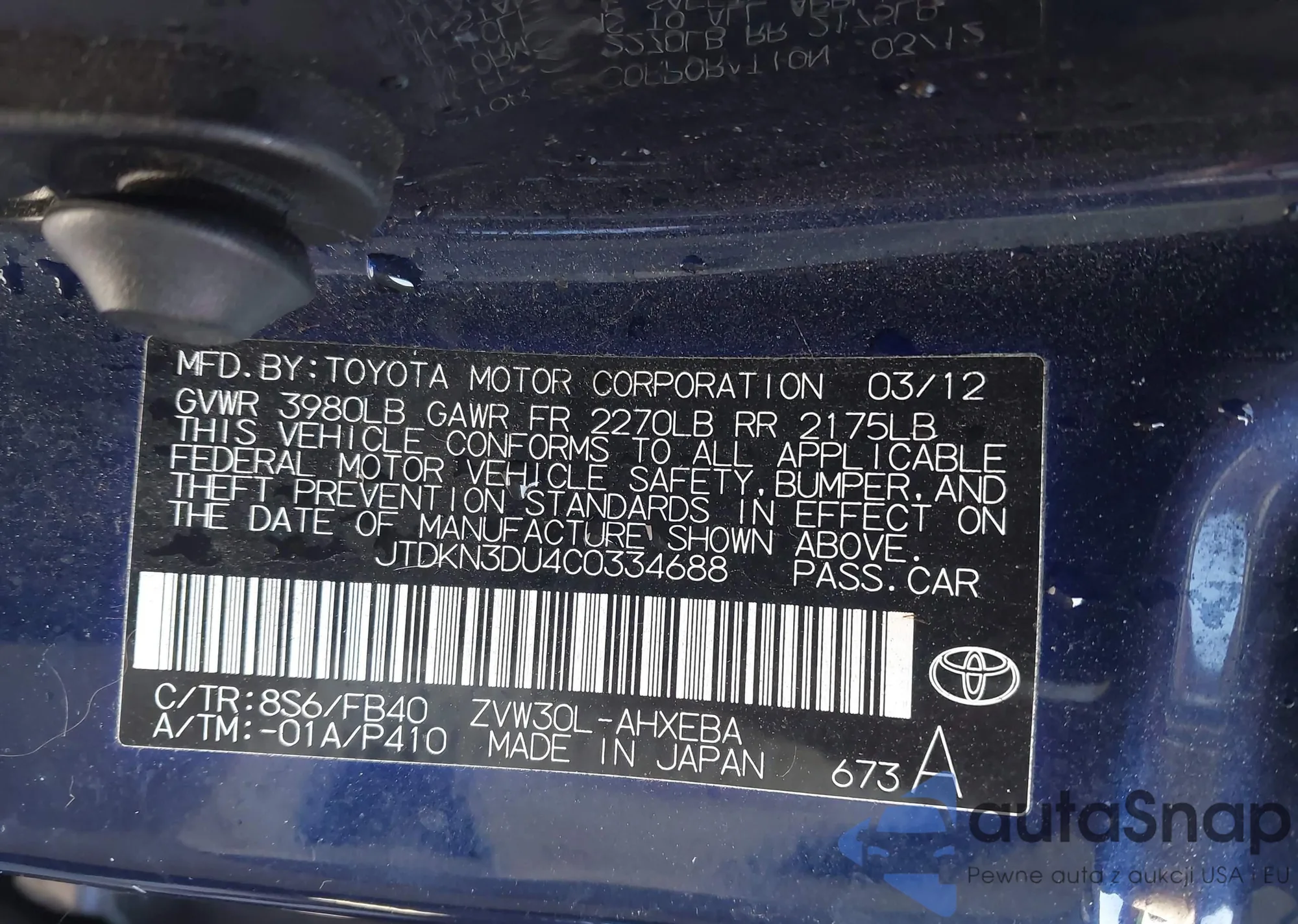 LOT: 43459368 VIN: JTDKN3DU4C0334688