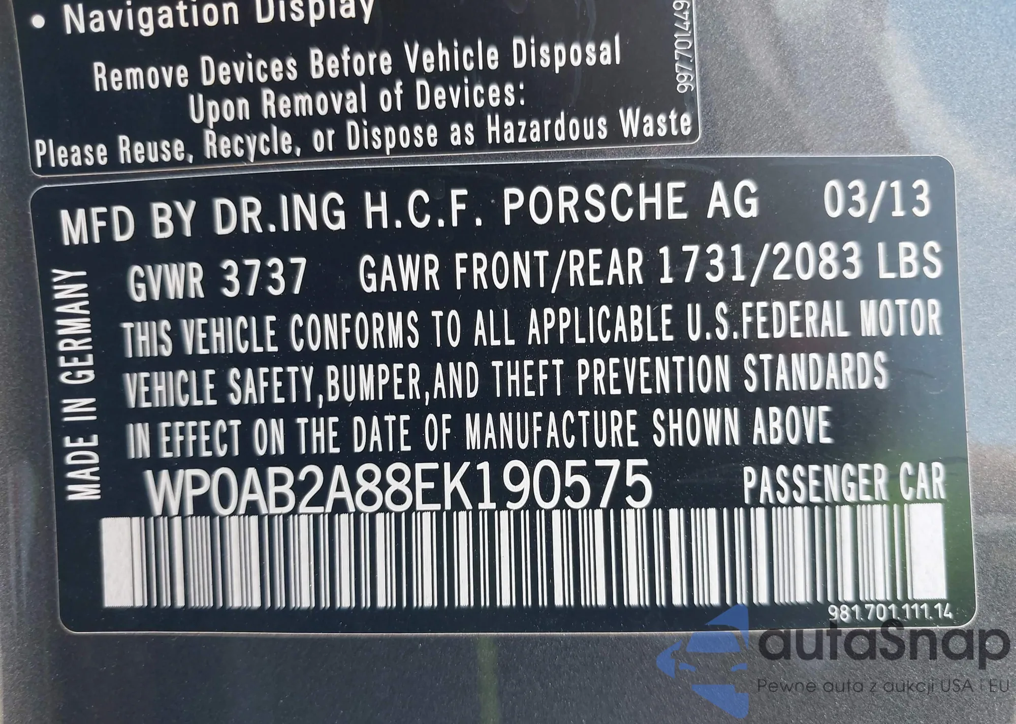 • VIN WP0AB2A88EK190575