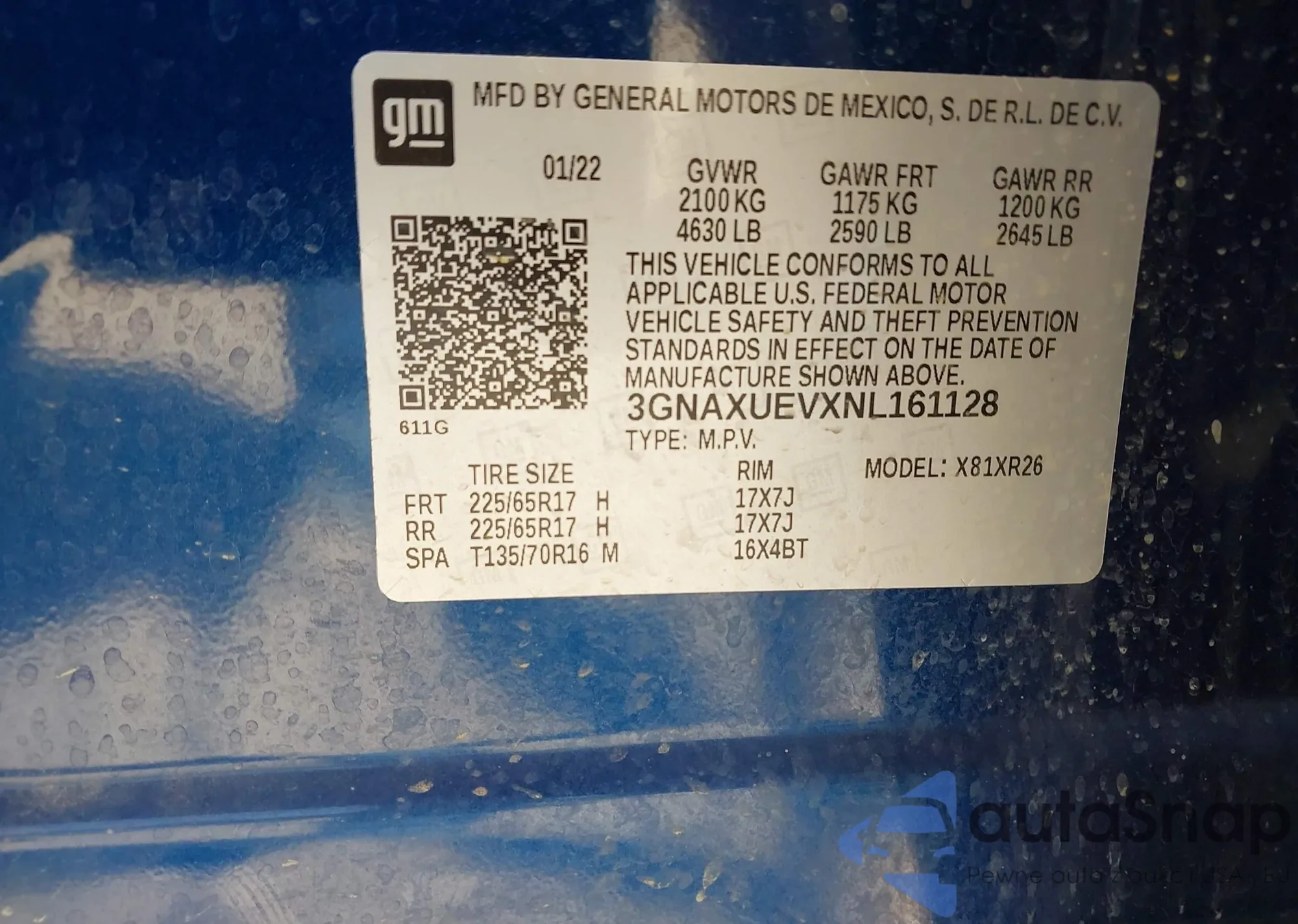 LOT: 43124181 VIN: 3GNAXUEVXNL161128