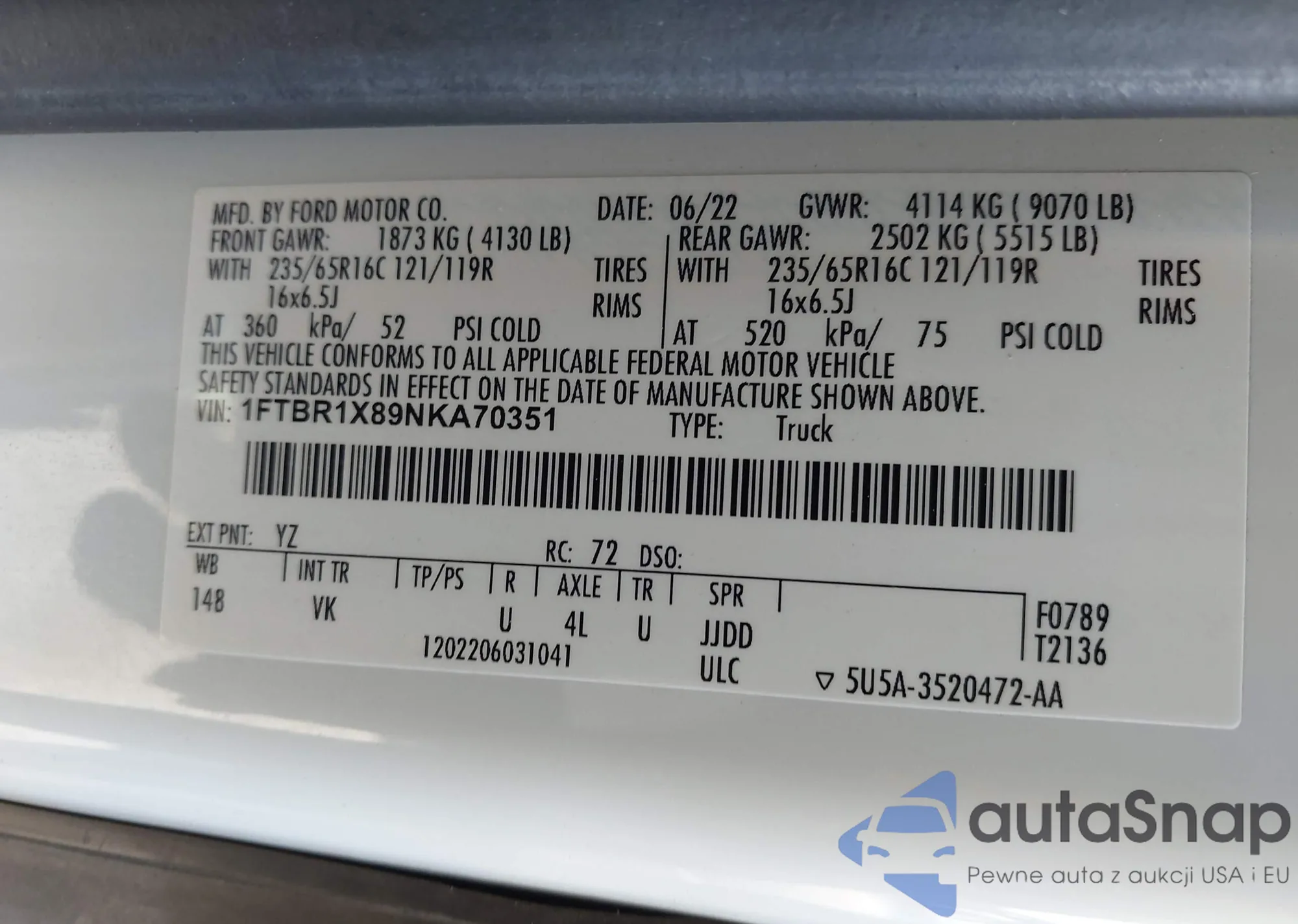 • VIN 1FTBR1X89NKA70351