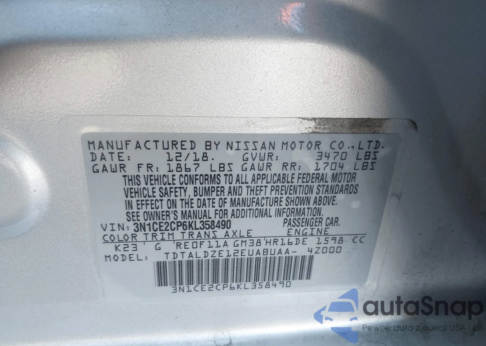 • VIN 3N1CE2CP6KL358490
