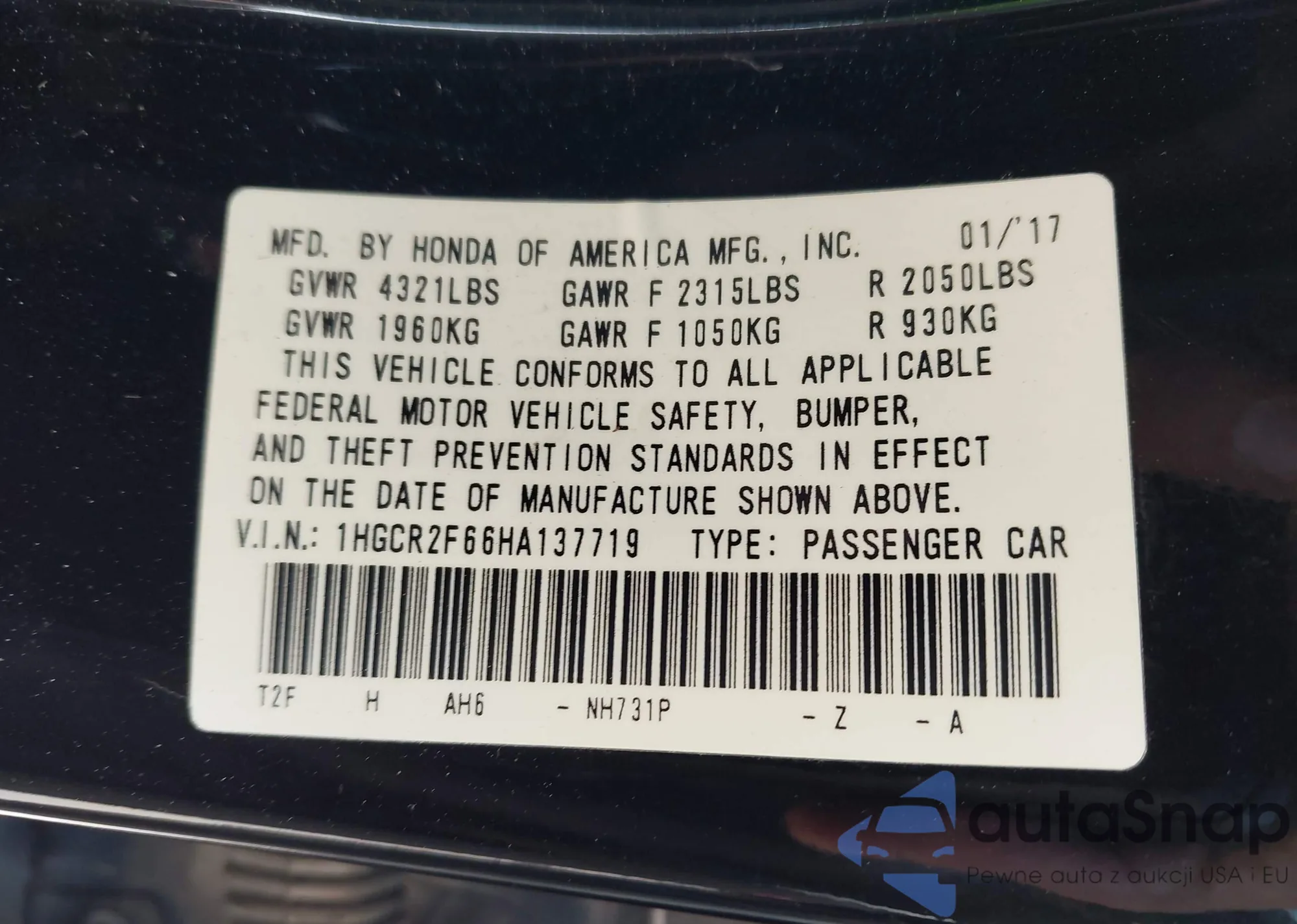 LOT: 43400319 VIN: 1HGCR2F66HA137719