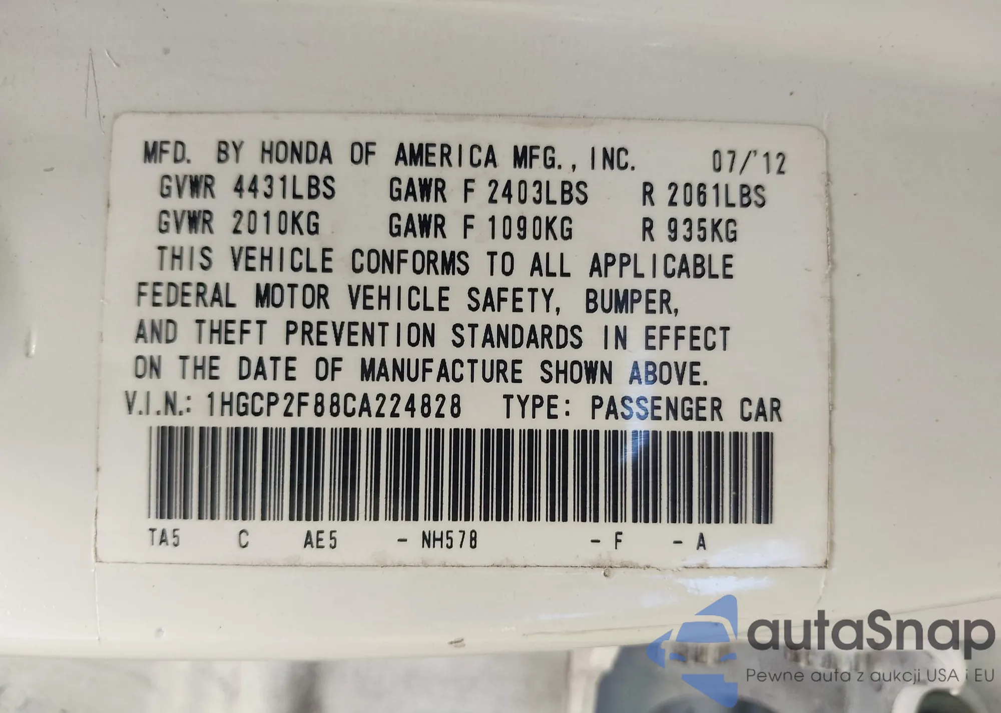 • VIN 5FNRL5H45CB111457