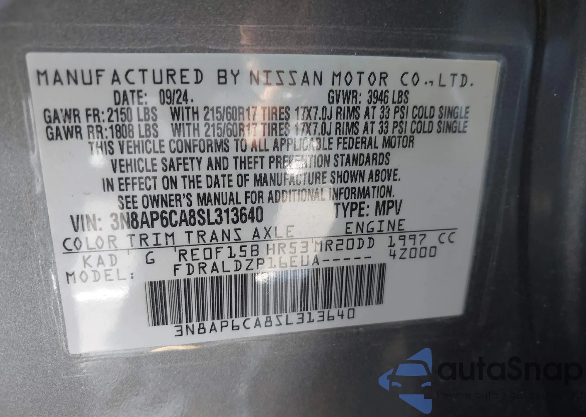 • VIN 3N8AP6CA8SL313640