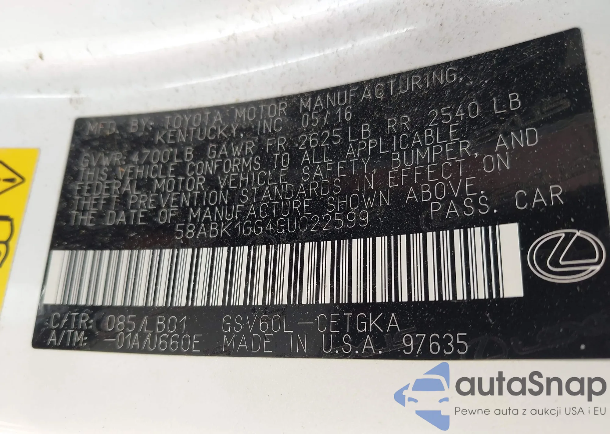 2016 Lexus Es 350 z USA, uszkodzony, nr VIN 58ABK1GG4GU022599