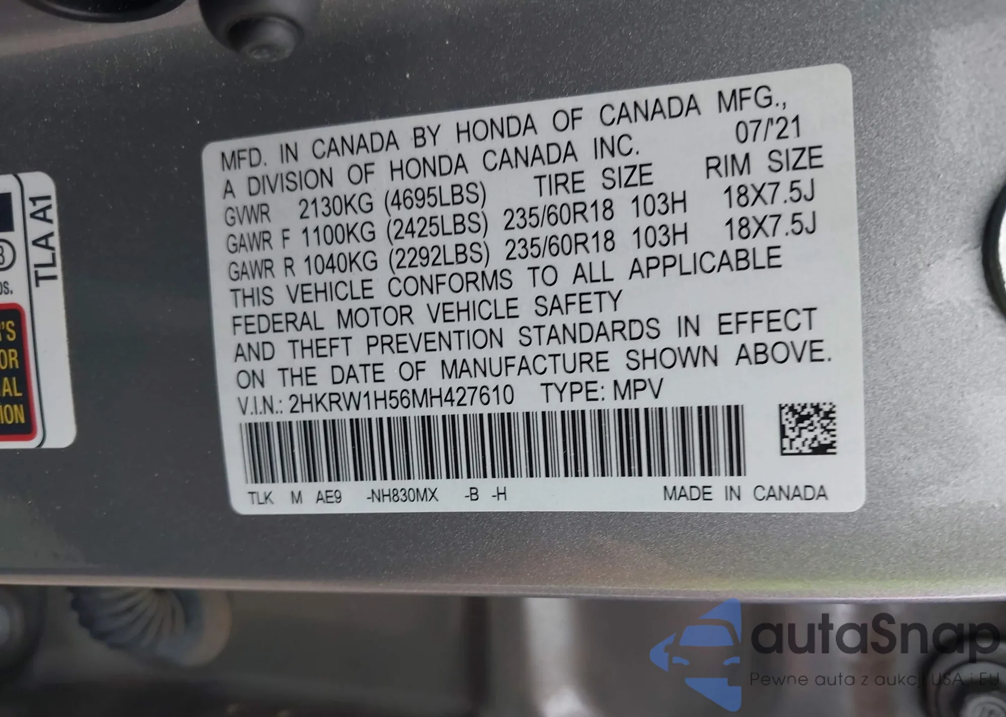 • VIN 2HKRW1H56MH427610