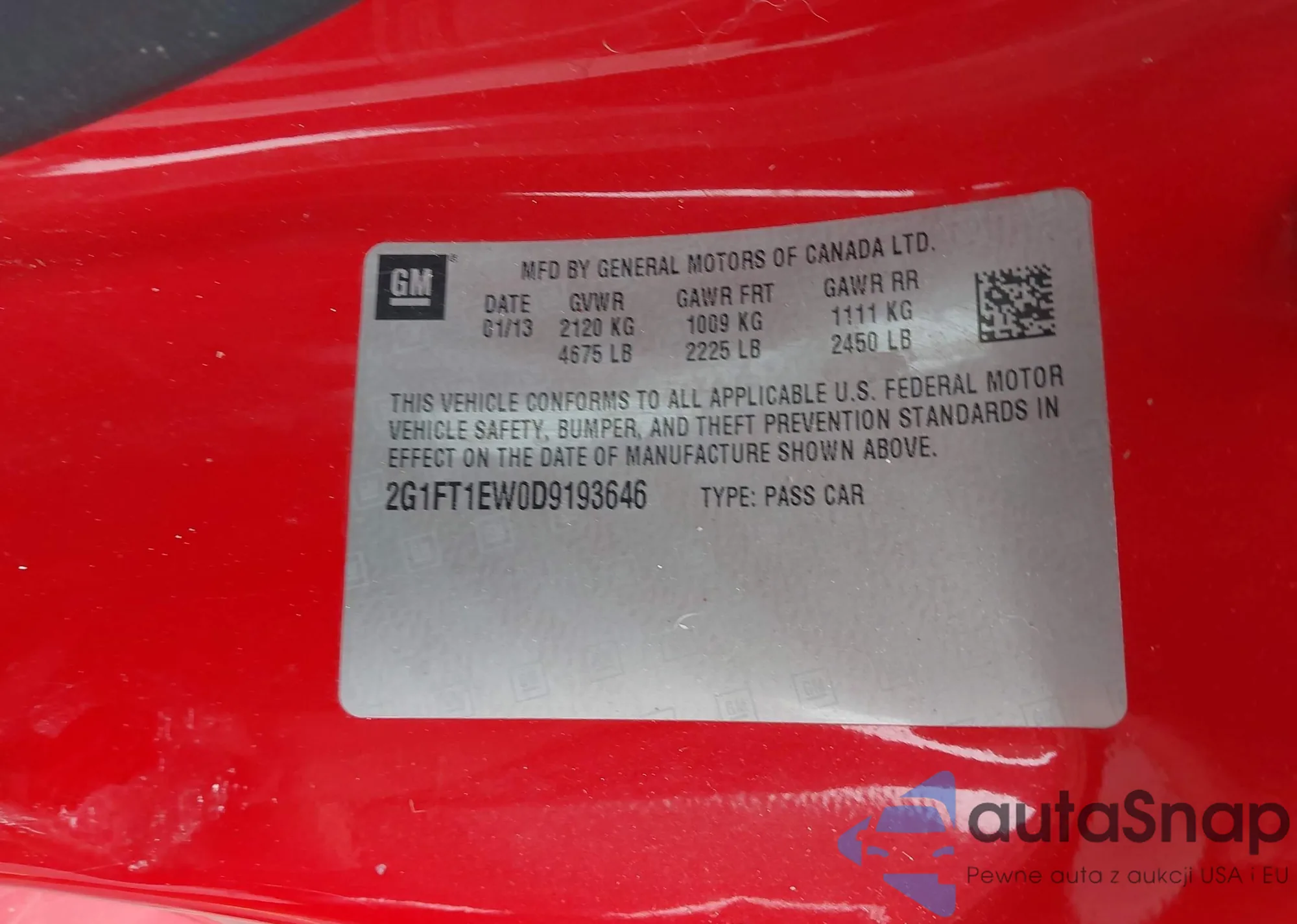 LOT: 43727681 VIN: 2G1FT1EW0D9193646