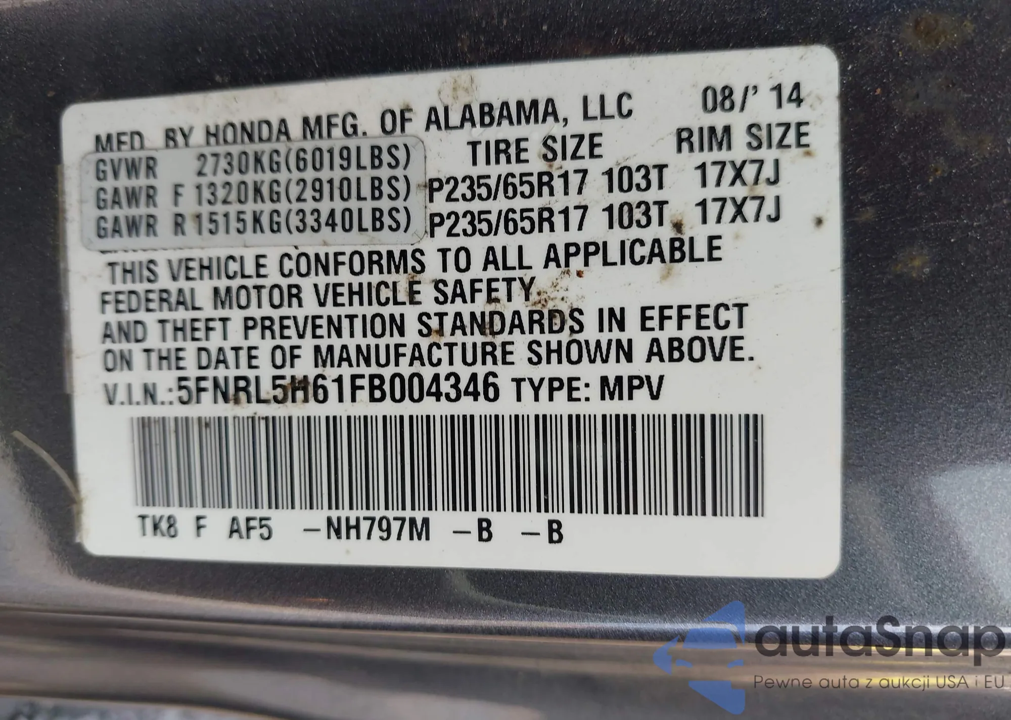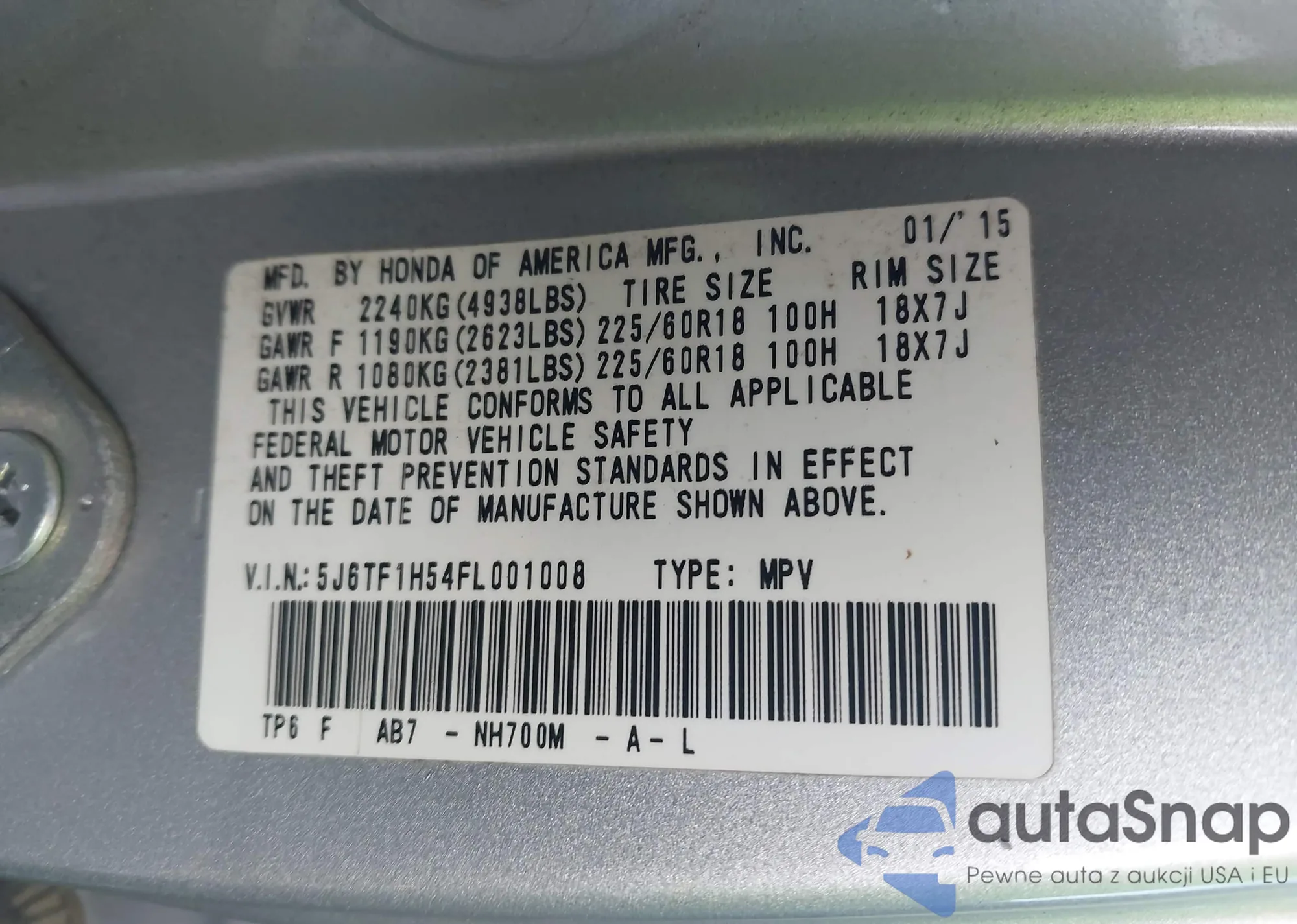 • VIN 5J6TF1H54FL001008