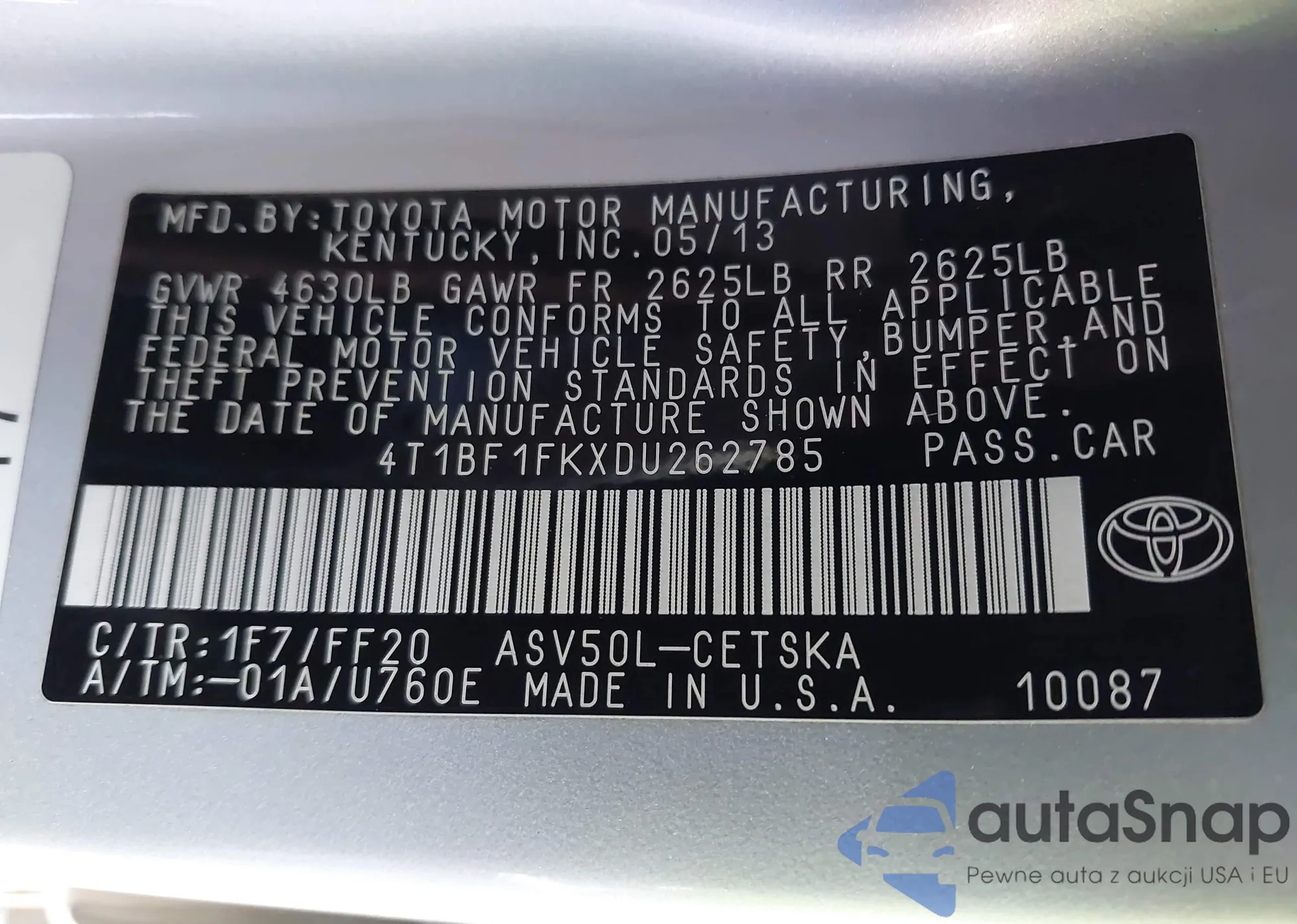 • VIN 4T1BF1FKXDU262785