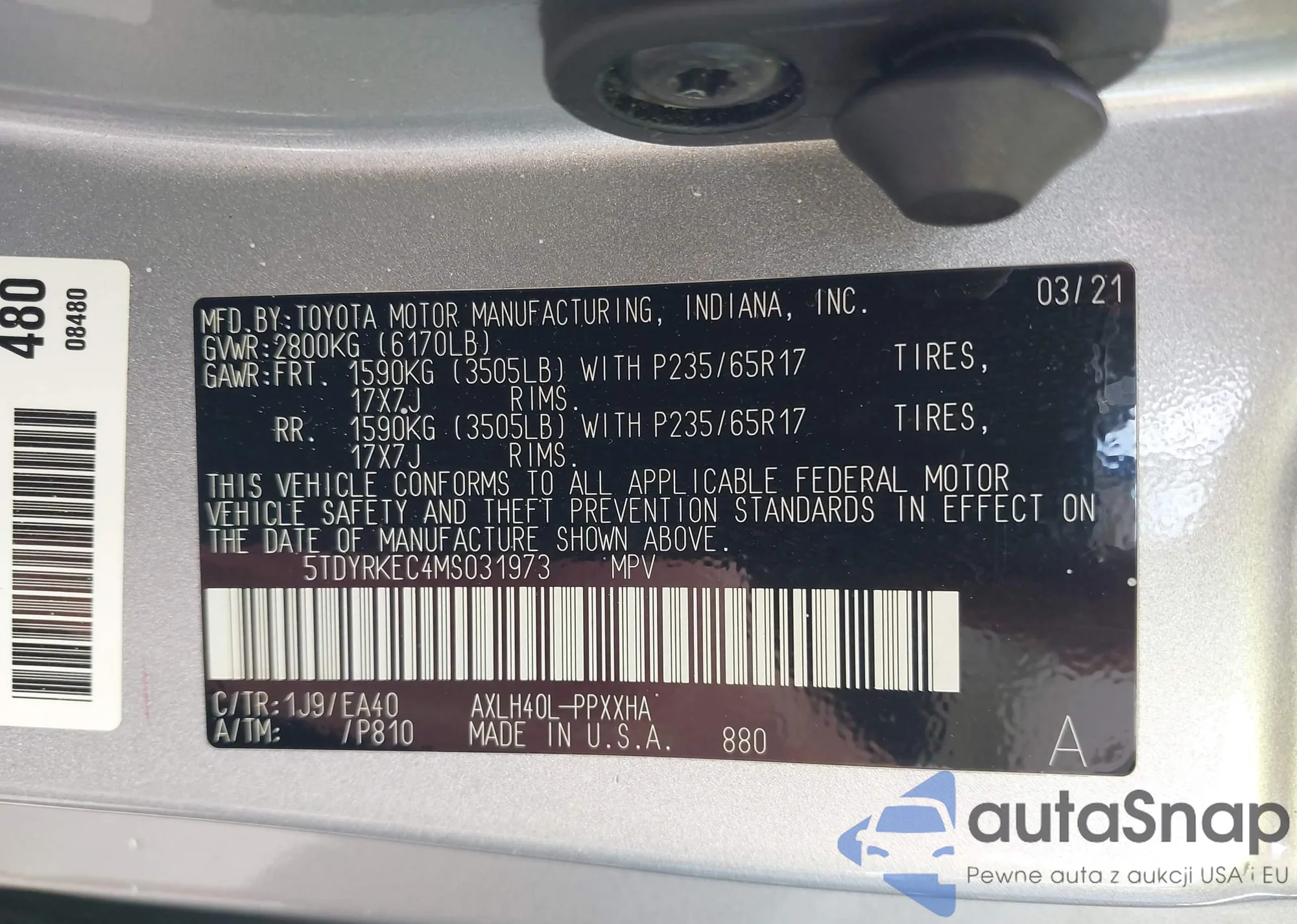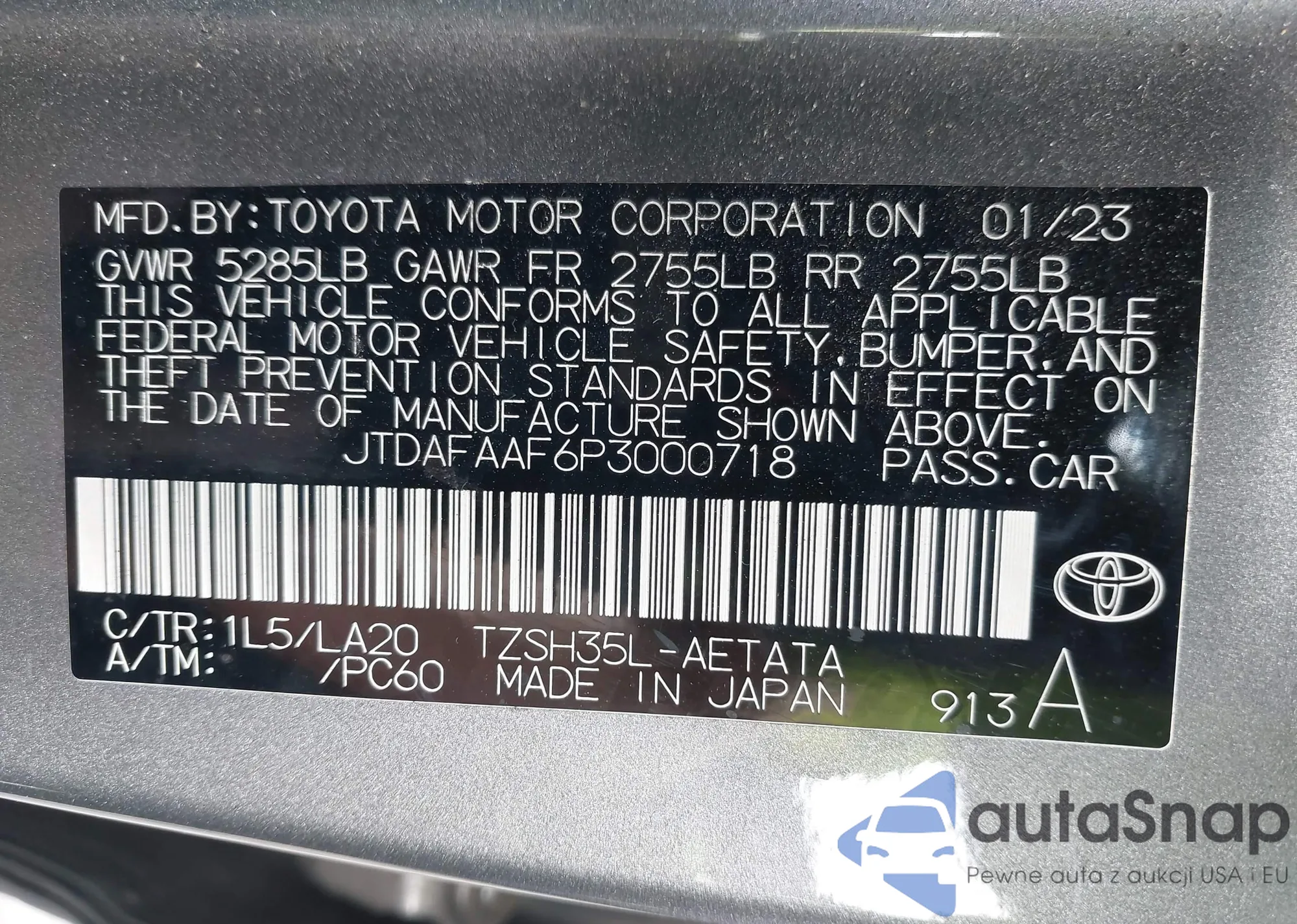 LOT: 43397662 VIN: JTDAFAAF6P3000718