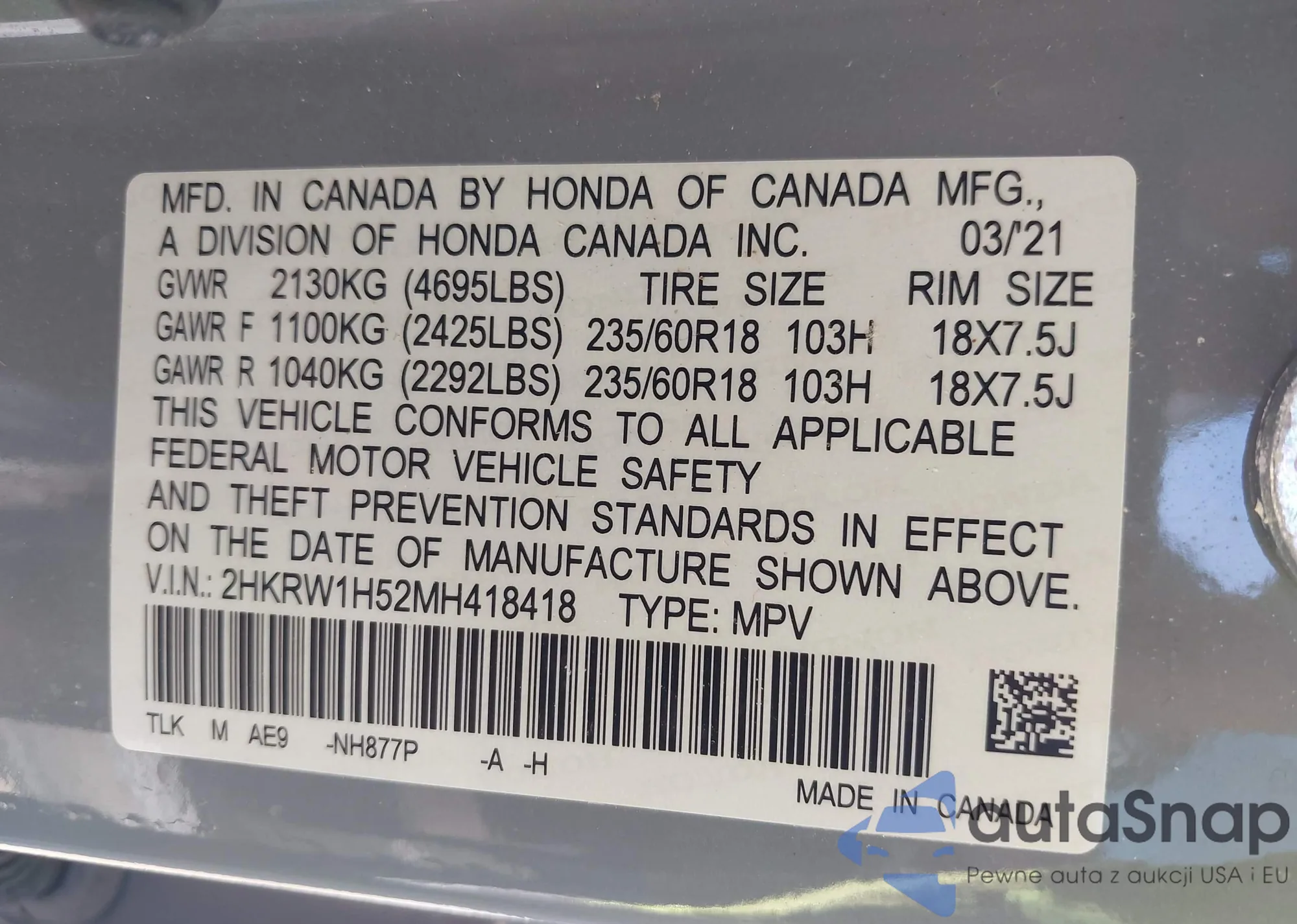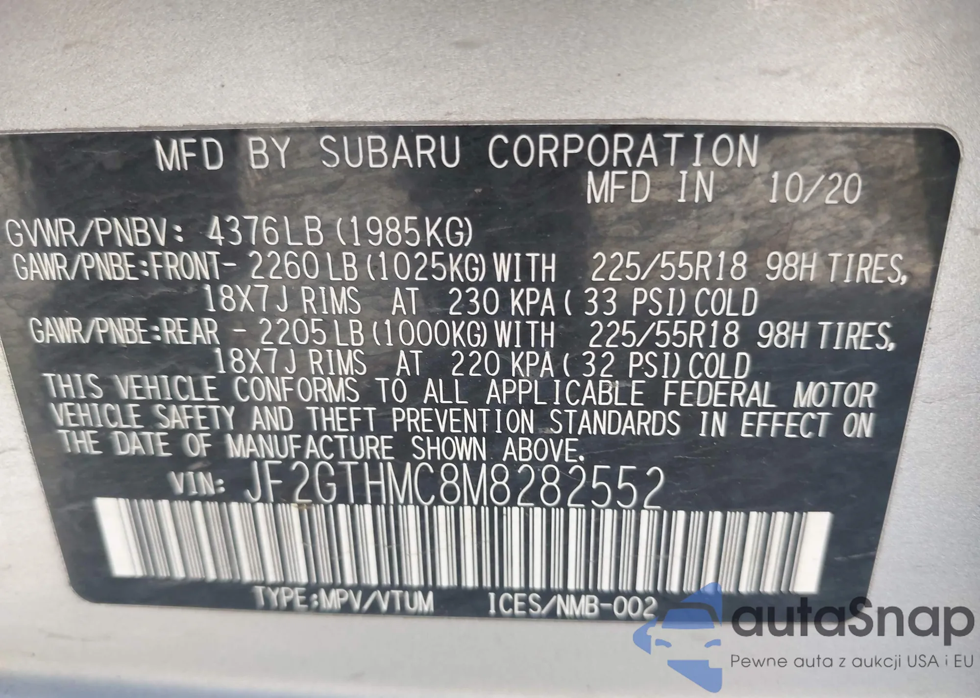 LOT: 43498859 VIN: JF2GTHMC8M8282552