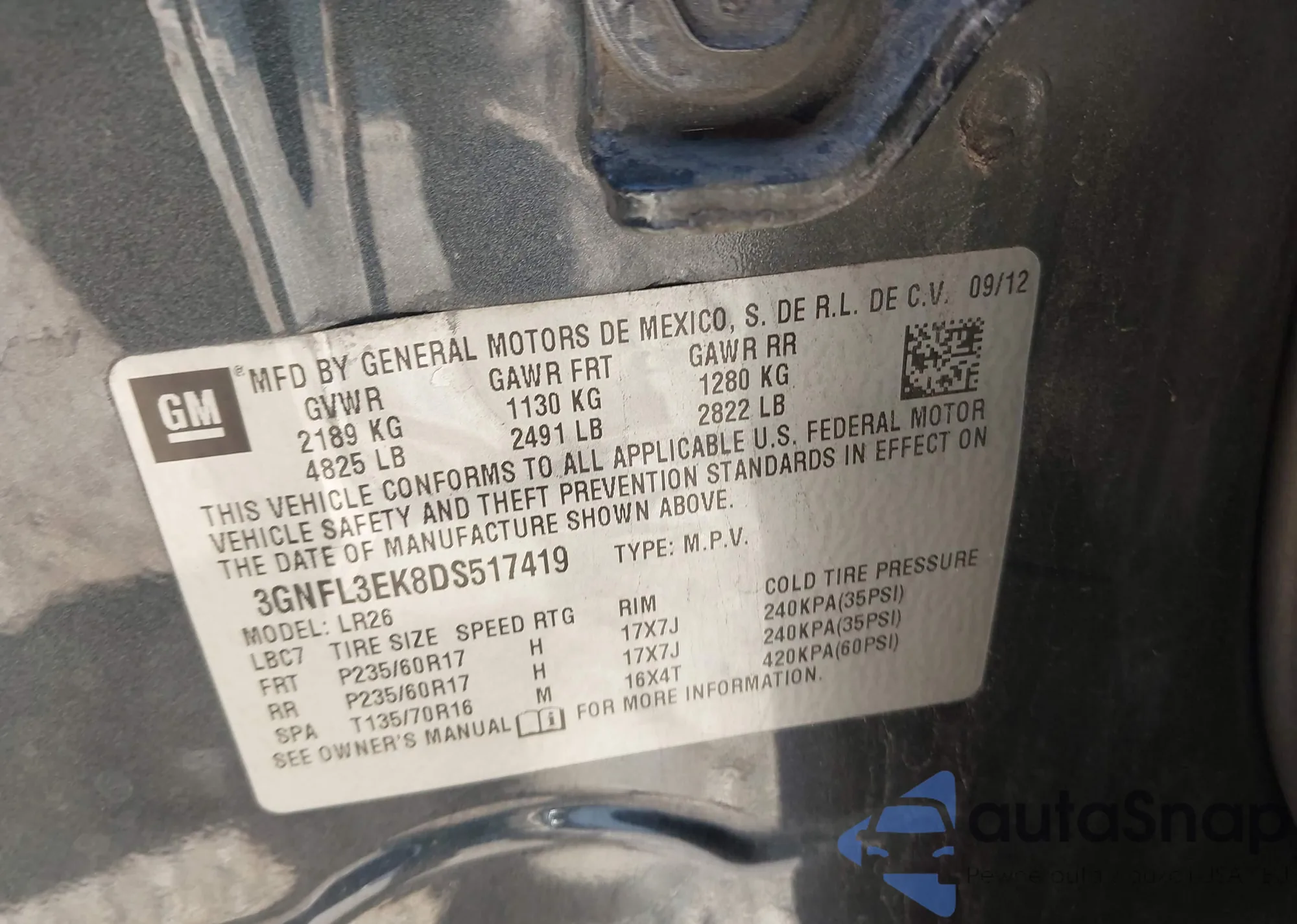 • VIN 3GNFL3EK8DS517419