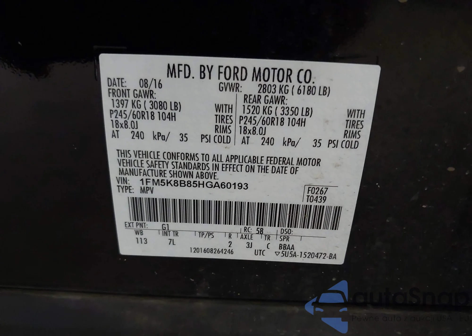 LOT: 43303977 VIN: 1FM5K8B85HGA60193