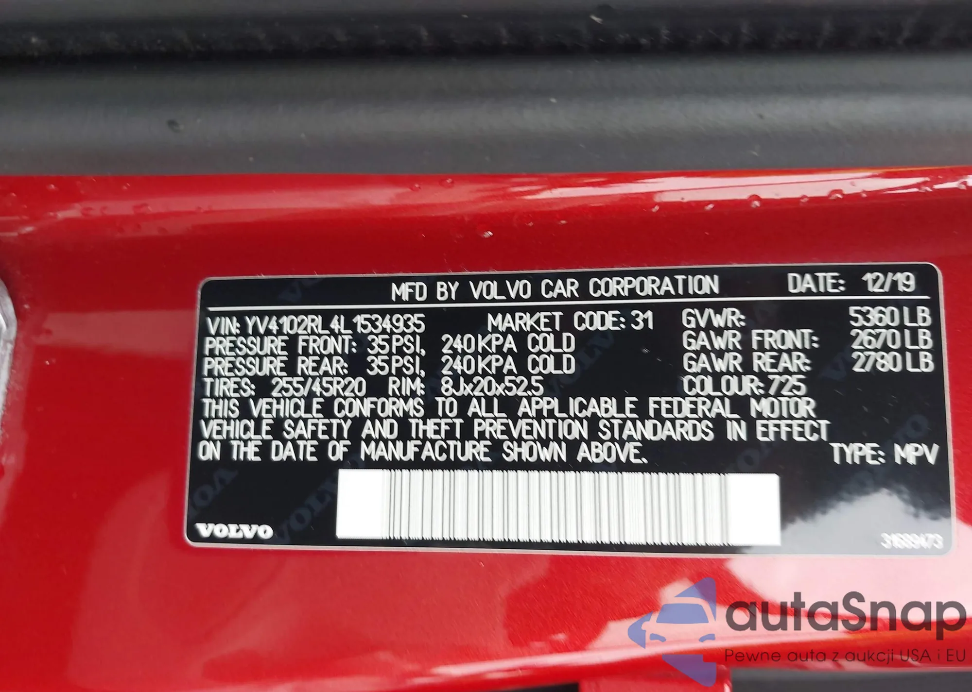 LOT: 43345639 VIN: YV4102RL4L1534935