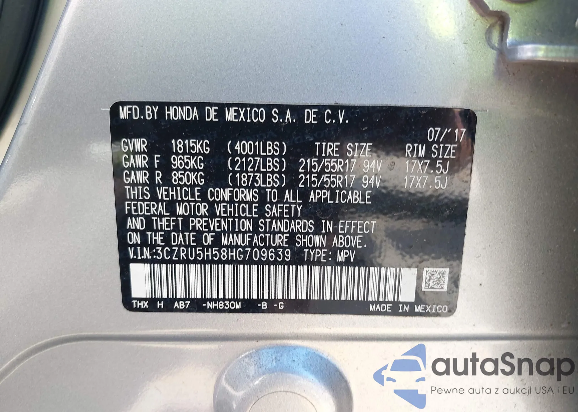 • VIN 3CZRU5H58HG709639