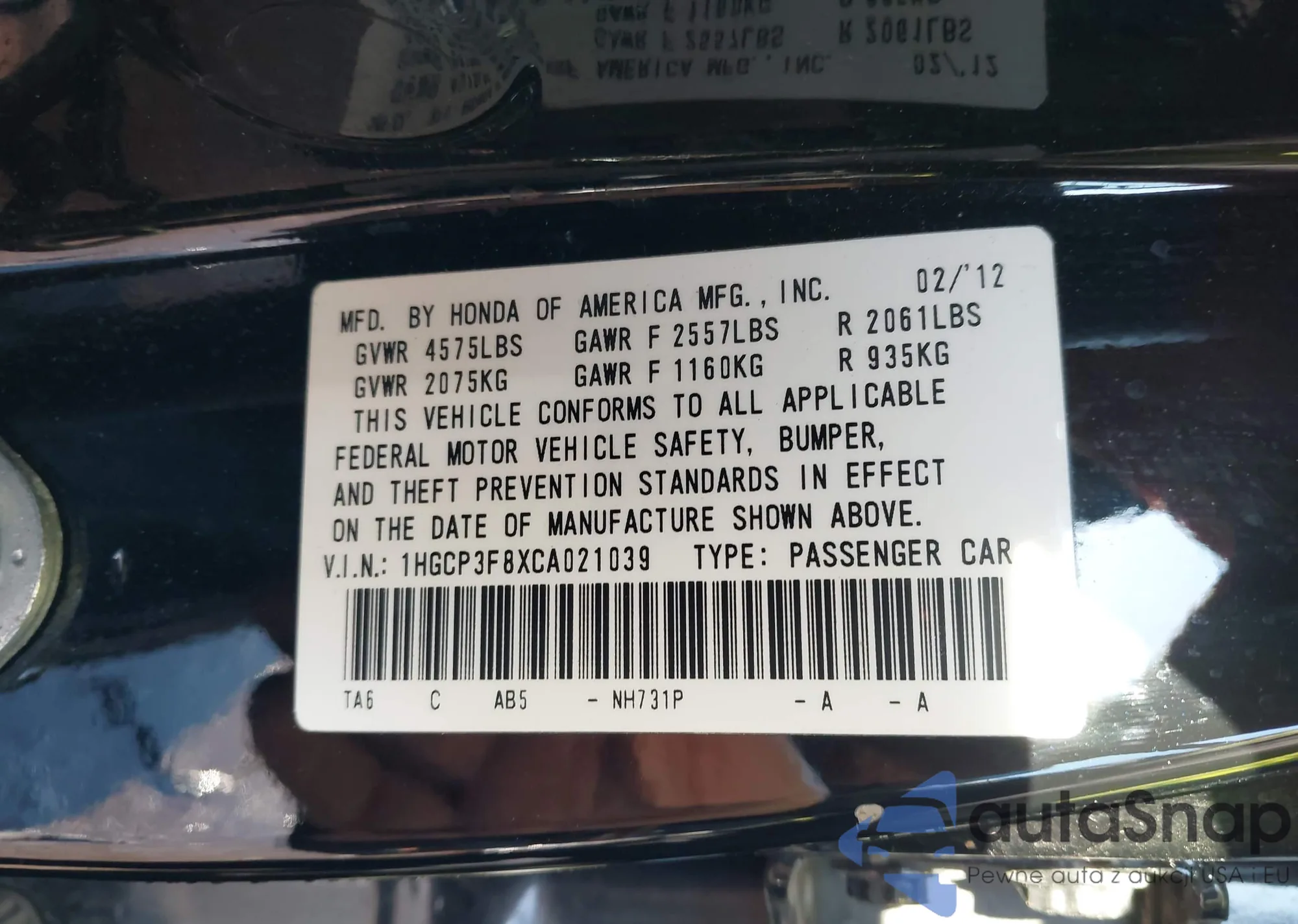 LOT: 43717041 VIN: 1HGCP3F8XCA021039