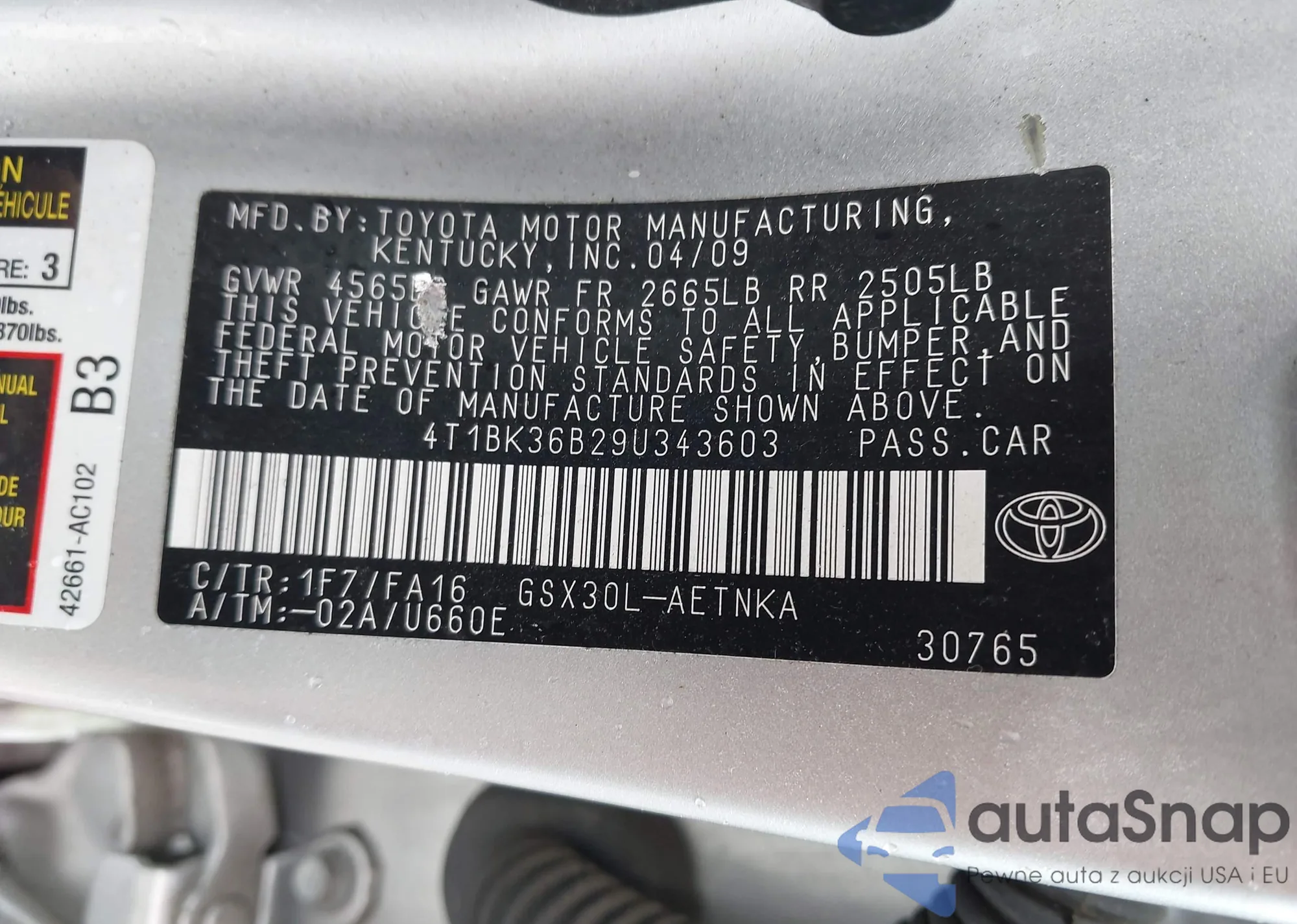 LOT: 43563677 VIN: 4T1BK36B29U343603